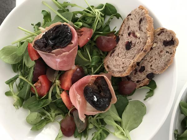 @juraj_benu_lekaren to je nasa najoblubenejsia kombinacia, kozi syr obaleny v sunke-slaninke so sunenymi slivkami a salatik