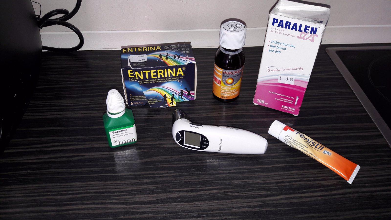dettol, sterilne gazove stvorceky, leukoplast dva druhy, nasivin detsky aj dospelacky, libenar, nurofen, panadol/paralen, ibuprofen, smecta, diazepam, dithiaden, opalovacie kremy a repelenty, uniflox, endiex, cierne uhlie, burrow kvapky, odsavacka soplov a cipky proti teplote, dva teplomery, tantum verde, ventolin, prospan, sinupret, canesten a milion inych veci...
