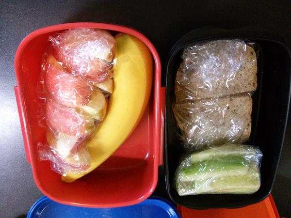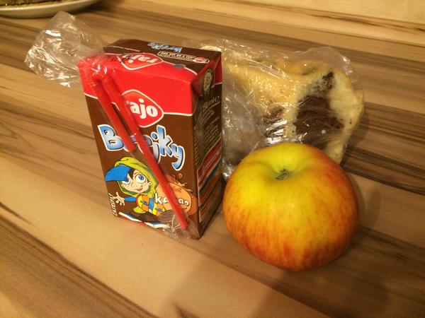 Ale u nás: pečivo so šunkou, syrom a paprikou, banán, 100% ovocná kapsička a na pomaškrtenie - slivkový perník 🙂