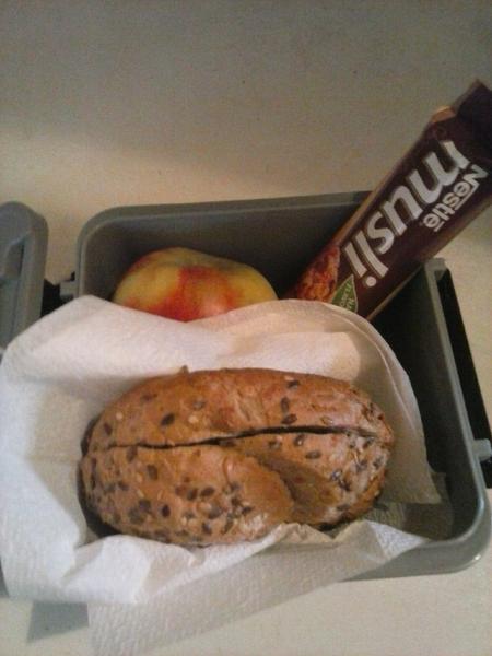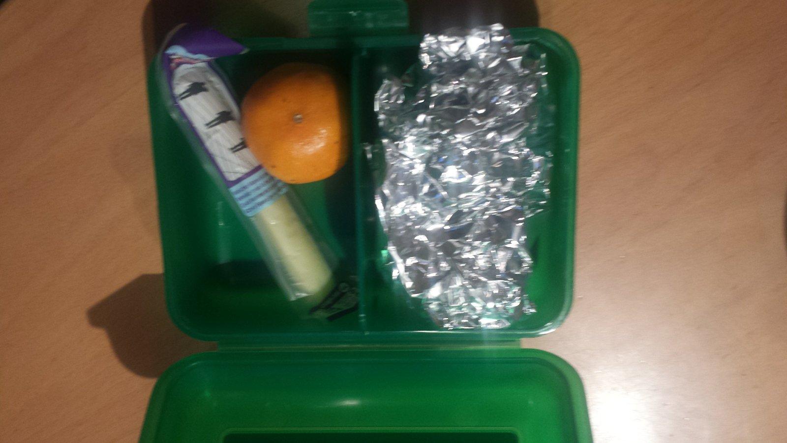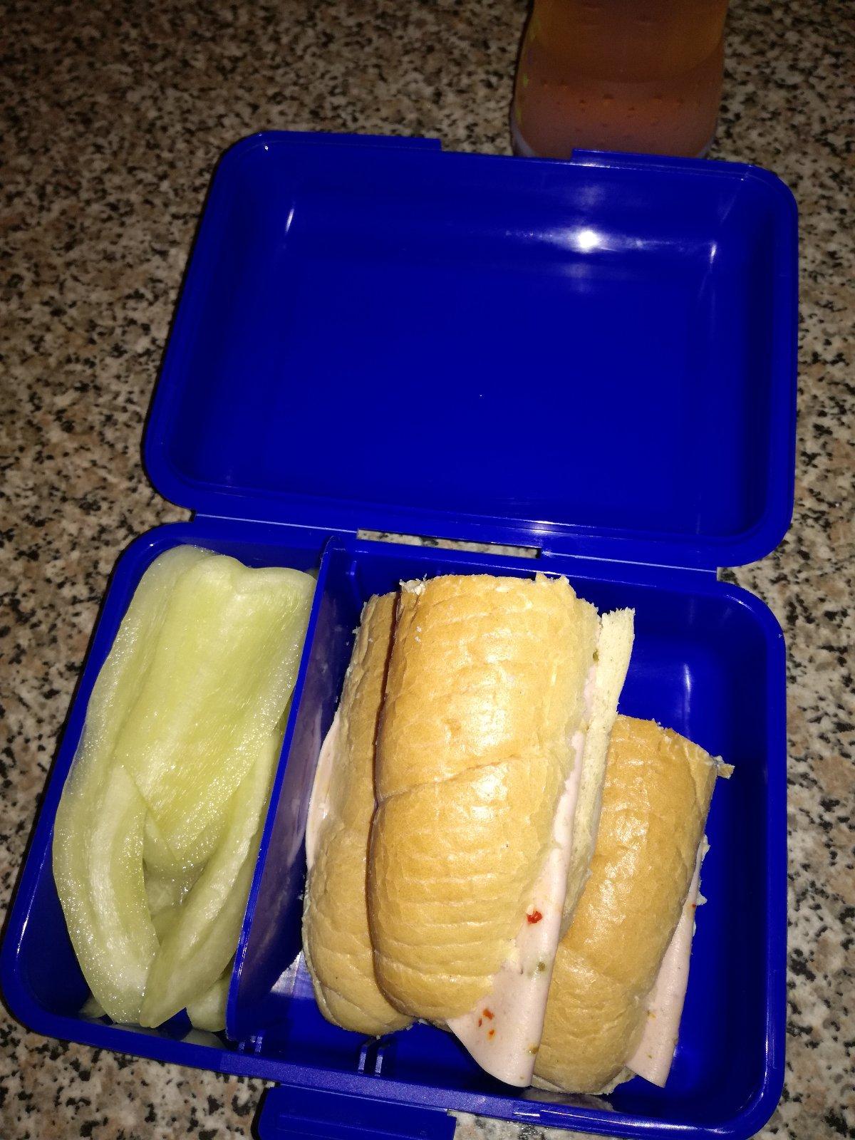 Tak dnes uz aj s fotkou -rohliček s detskou šunkou a kečupom, nakrájané zelené jabĺčko, mandarínku, vyživka a malá sladkosť.😉a fľaša čistej vodičky k tomu všetkému 👍 a brejky vanilkový už padol za obeť 😀😀😀hneď ráno.