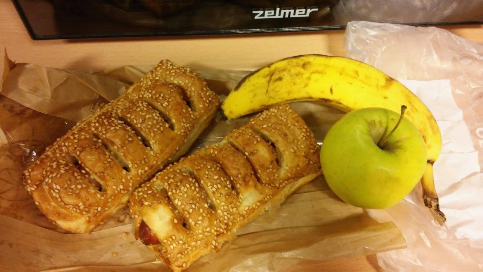 My dnes len taká nevábna, narýchlo desiata, lebo som musela letieť skoro do práce - takže len Lidl hot dog (inak u nás veľmi obľúbený), jabĺčko, banán a v škole si k tomu kúpi ešte Brejky... 😉 Do flašky nesladený čaj.