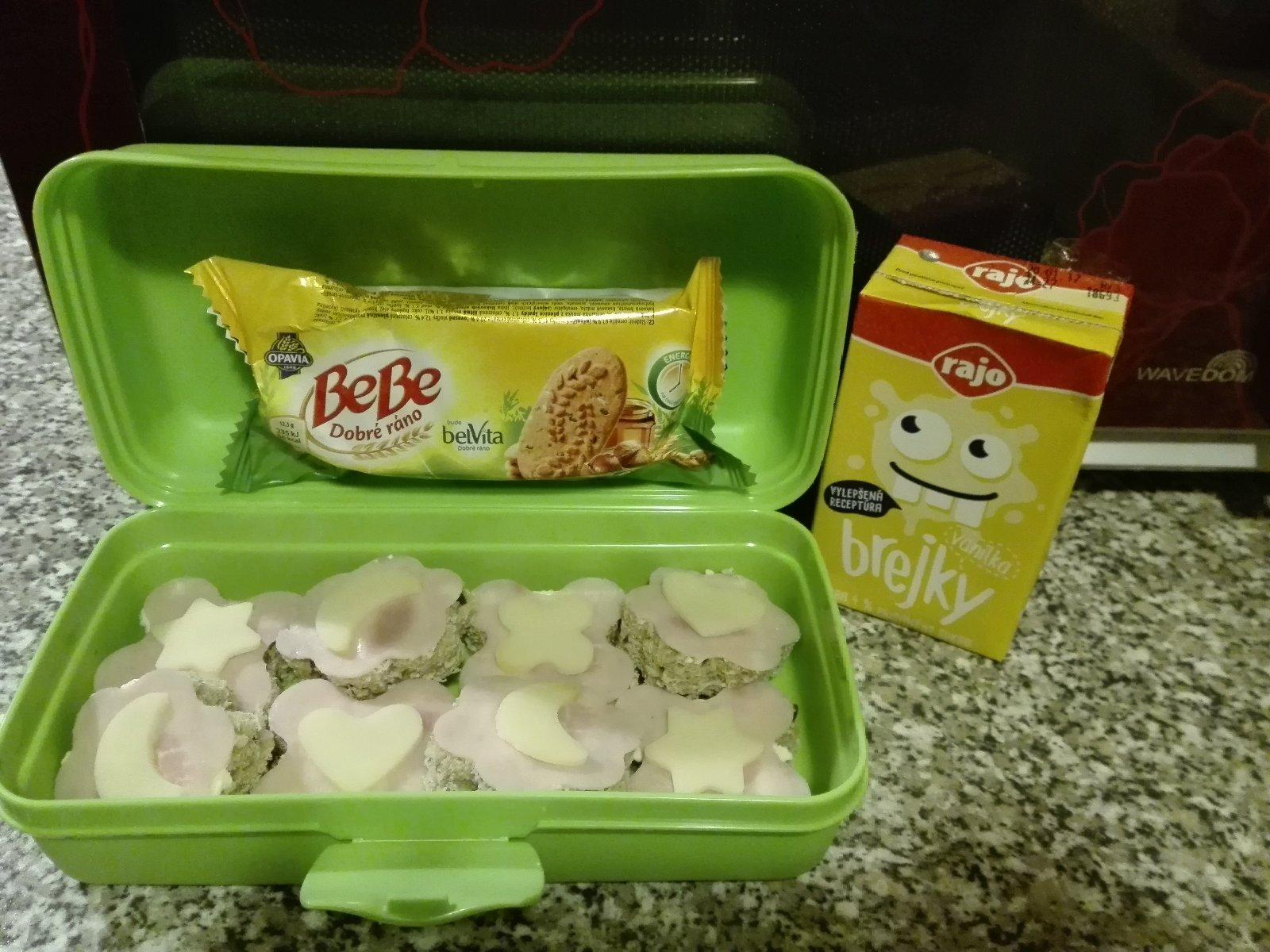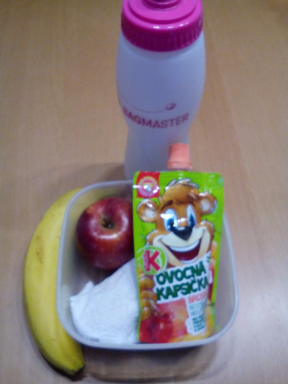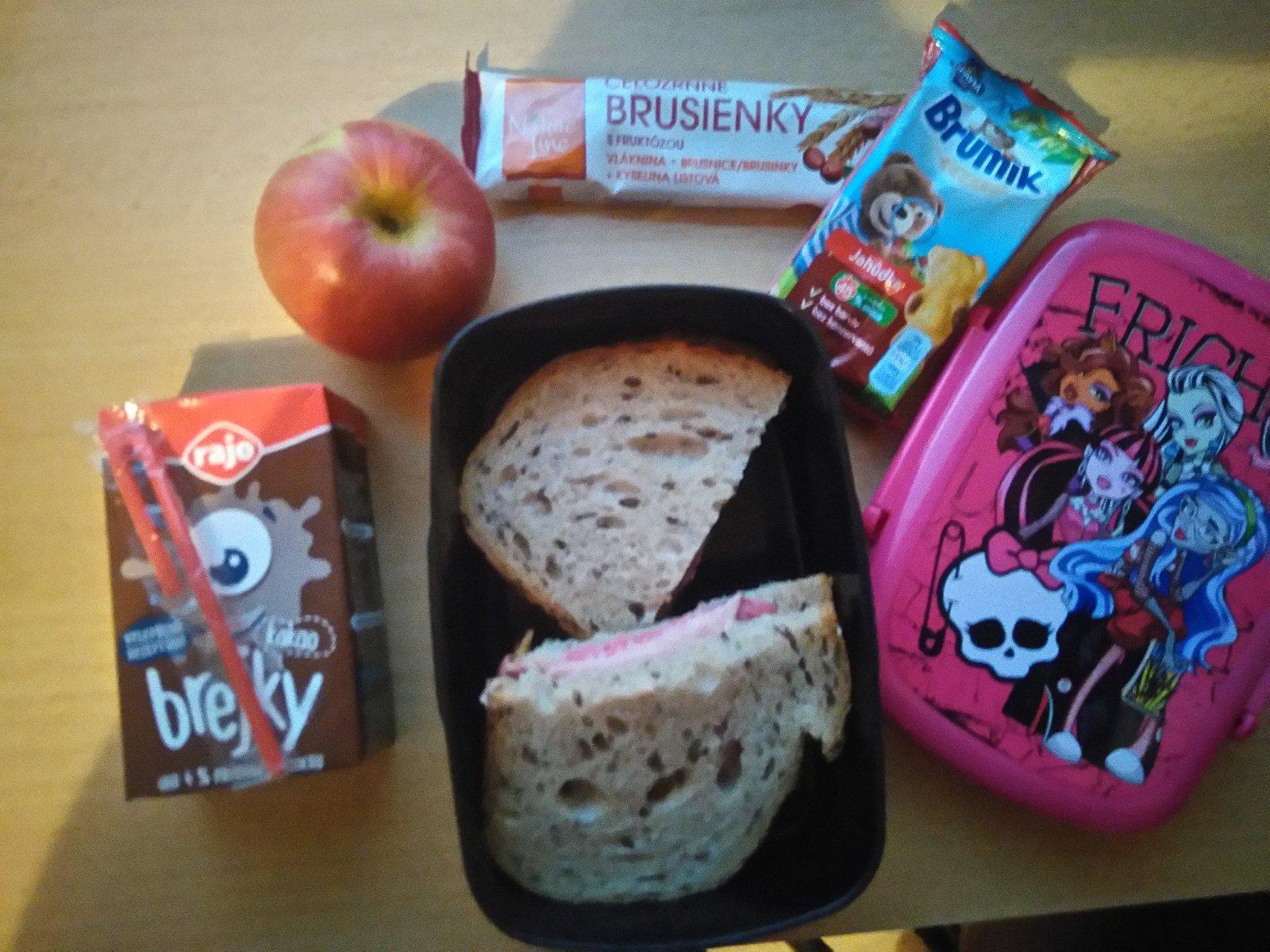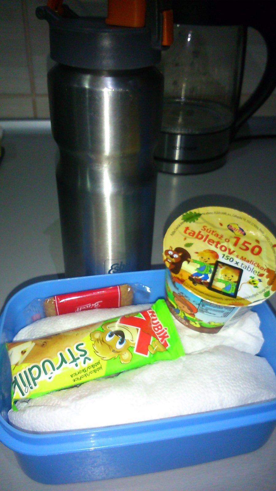 Súťaž som si všimla až teraz, tak nemám žiadne foto :( ale naša desiata vždy obsahuje celozrnné pečivo so šunkou, či domácim džemíkom, nesladený čajík, ovocie a ak je tak aj kúsok domáceho koláčika. Boxík by nás veľmi potešil.