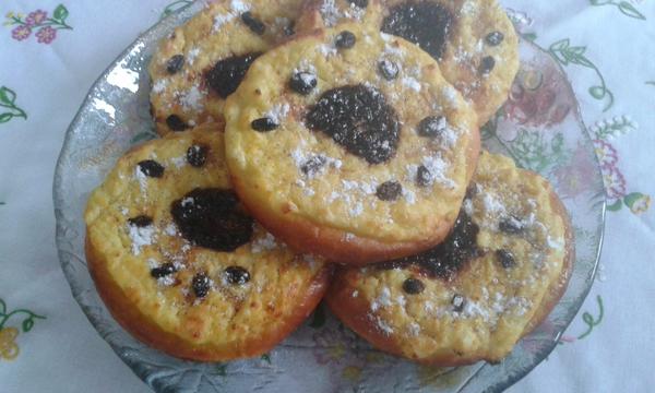 100g krupice, 50g hladkej múky, 60g práškového cukru, 70 ml rozpusteného masla, 100ml mlieka, pol prášku do pečiva, 2 vajcia, 1 ČL džemu - a postup taky ako pri perníku..