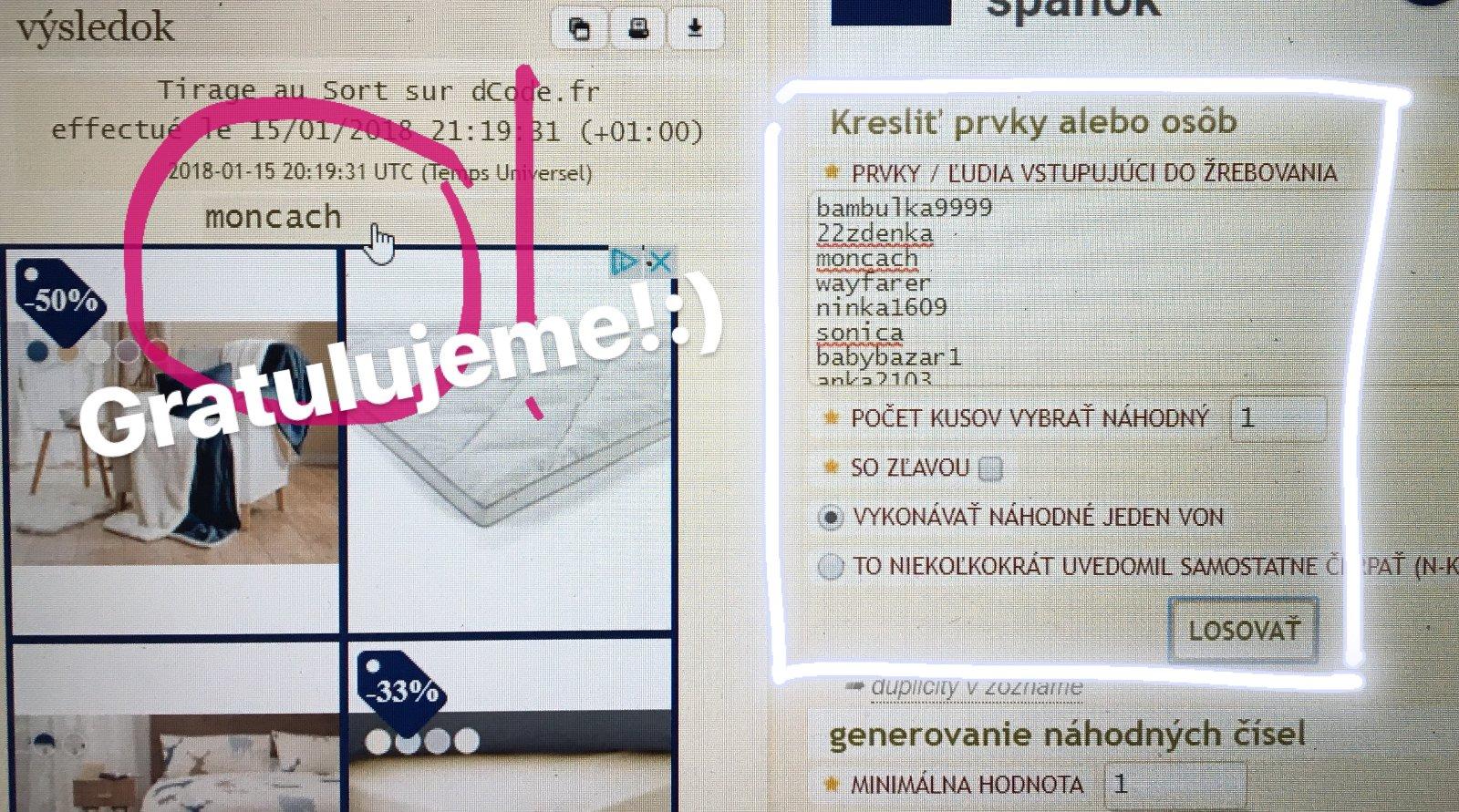 GRATULUJEME VÍŤAZKE S NICKOM @moncach 🙂 Vyžreboval ju náš pomocník, randomový server - foto ako dôkaz prikladám tiež 🙂 Ešte raz gratulujem a teším sa na vás už zajtra! 🙂