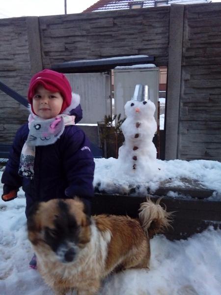 Jasne , ide sa aj von 🙂 pred dom kde ma plac , kde sa vygeží kolko len chce , vyhrá sa aj s pieskom 🙂 prechádzky to je naše , chodime k Jazierku , na Fitness proste pochodíme celu našu dedinu a domou do tepla 😉 ❤ Emka so snehuliakom ❤