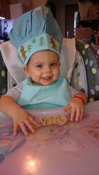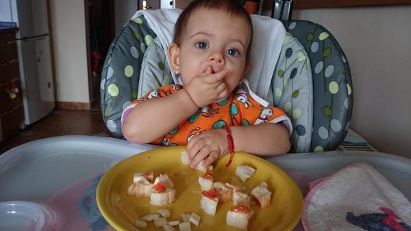 Dnes som mala rohlík s maslom a rajčinkou. Chutí mu aj domáci jogurt (nemáme fotku). Tiež pomáham maminke piecť domáce sušienky.