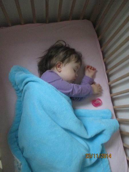 Nasa mala ma teraz obdobie ked cez den spi v kociku a to bud na balkone alebo vonku. Takto prespi dve hodiny doobeda a dve az tri hodiny poobede. Ked je zle pocasie, tak spi v postielke a uspavam ju v kresielku. Pred tym ako ju ulozim na vecerny spanok, ma dve vecere s dvojhodinovym odstupom. Najprv kasicku na dobru noc a neskor mliecko. Znova ju uspavam v kresielku. V noci sa zobudi len raz. 🙂