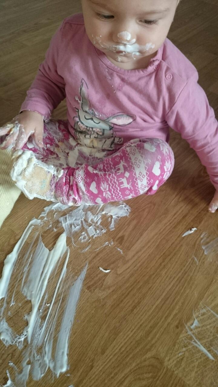 A ona sikovna objvila jogurtik, ktory mala nachystany na desiatu. Asi uz bola hladna tak zacala ohryzkavat vrchnacik az ho zubkami prederavila. Slecna sa ho snazila nejak spapat, no dopadlo to tak, ze ten jogurt skoncil na obleceni, na celej tvari a samozrejme policeny po celej plavacke v obyvke 😀 😀 Mm sa to snazil zamaskovat a poutieral rychlo vlhcenymi, akurat ja ked som isla prat som sa zababrala tym jogurtom z oblecenia... vtedy sa priznali a tot je aj dokaz 😀 😀 😀