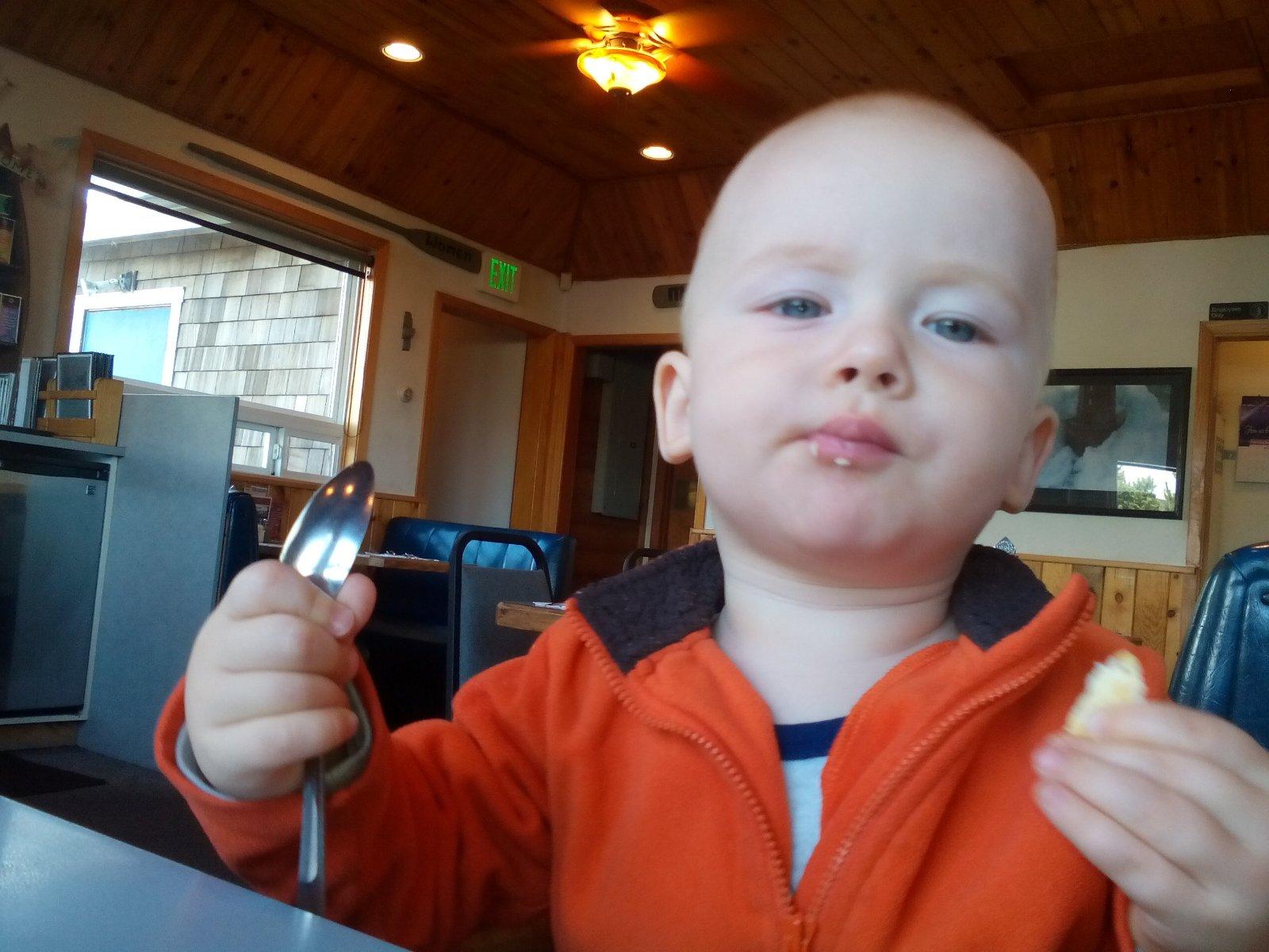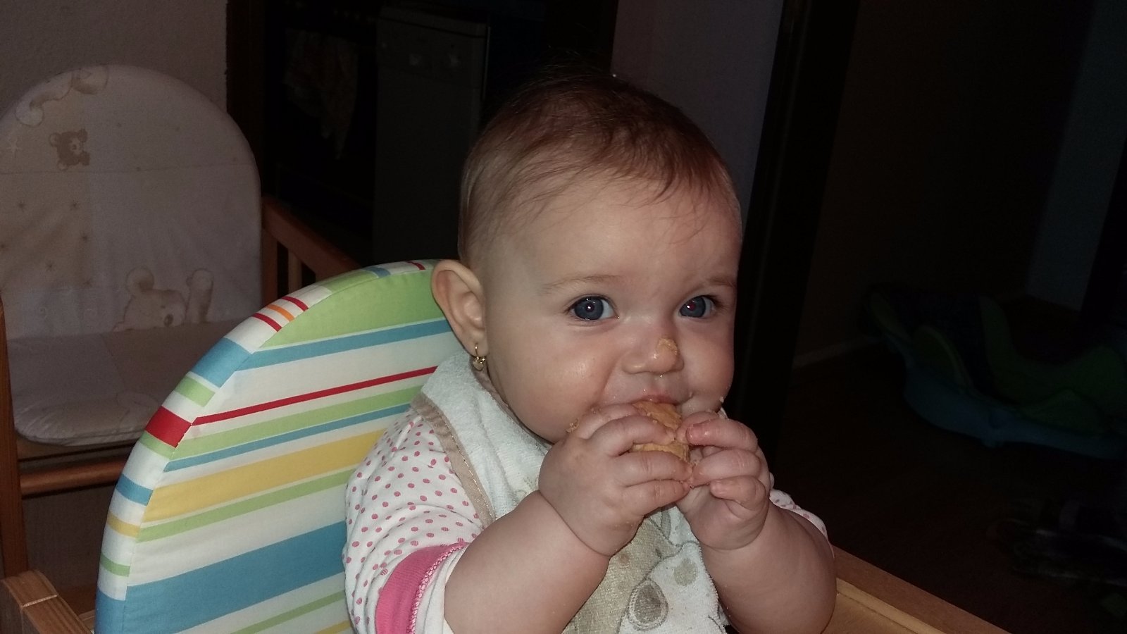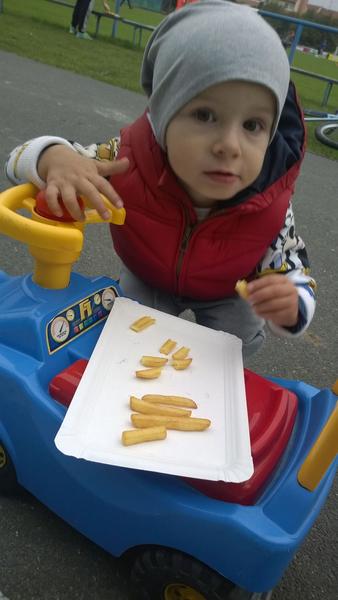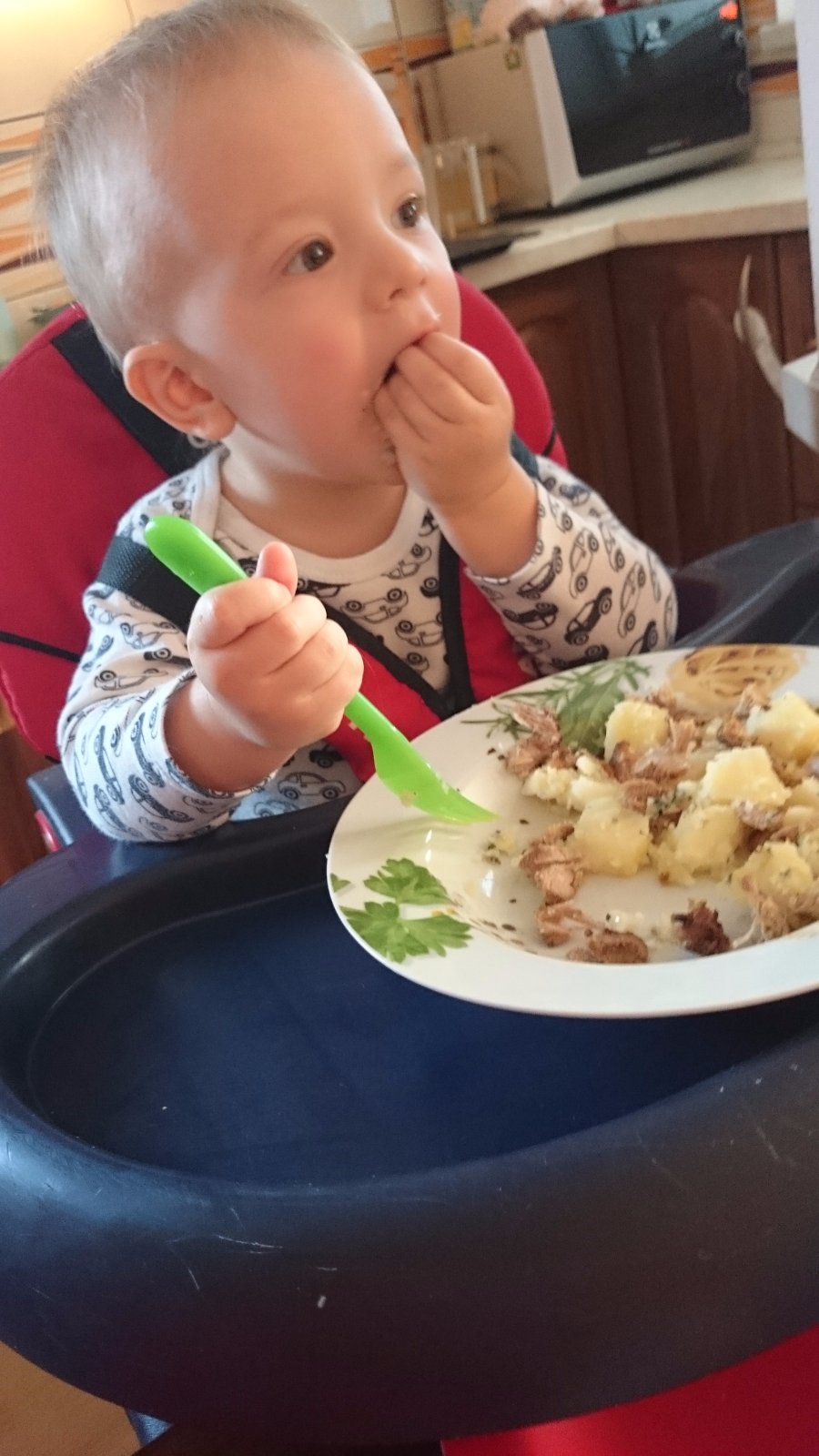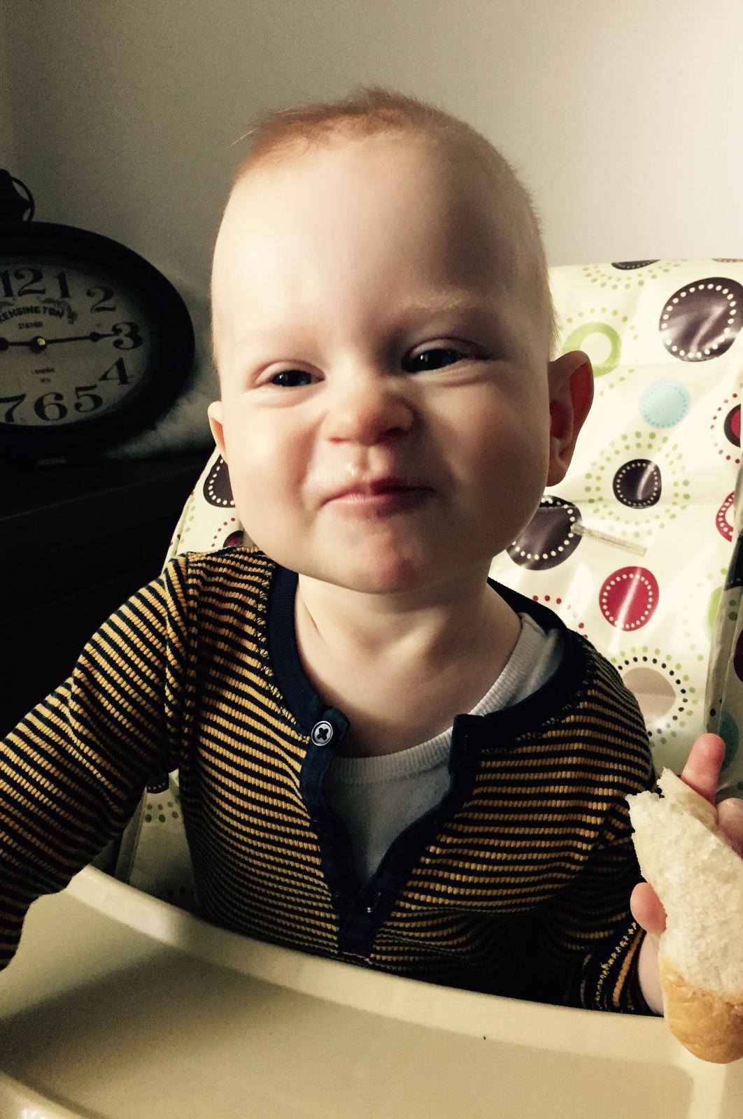 Nas Marco prichyteny s kukuricnou chrumkou 😀Pokial ide o jedlo,nie je nejaky vyberavy a vdacne spapa vsetko,co mu navarim,snazim sa mu hlavne varit zdravo,papa vela zeleninky,maska aj ovocia,na veceru obilninove kase 🙂Zo zeleniny ma najradsej cuketu a zelene fazulky,z ovocia hrusky,ale nepohrdne prakticky nicim 🙂Ma velmi rad aj prikrmy od Hipp,tie ovocne mu teraz davam takmer kazdy den,aby mal pestru stravu,kedze ovocim,ktore sa predava v obchodoch nie som velmi nadsena,najradsej ma kombinaciu hruska-slivka 🙂A zo zeleninovo-masovych ma najradsej spagety Bolognese a aljasku tresku so zeleninkou a cestovinami 🙂