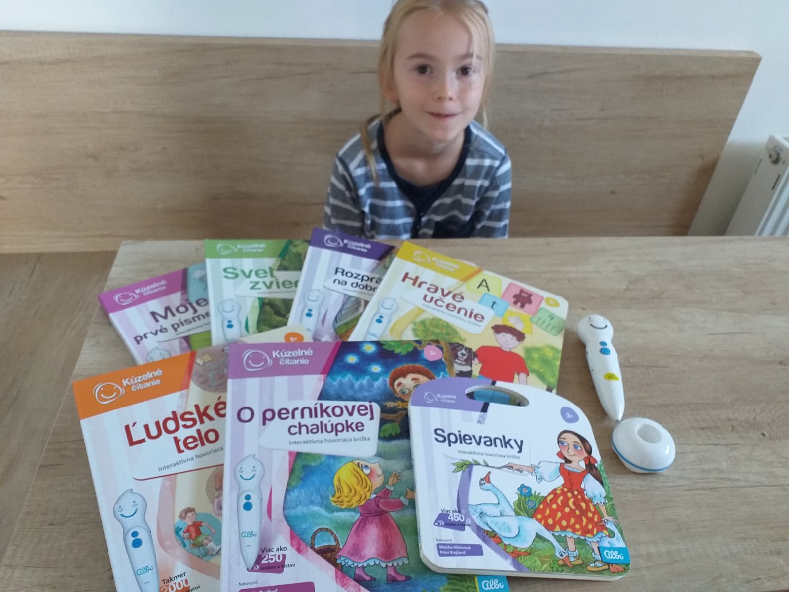My máme doma asi 7 alebo 8 kníh... Naše deti majú veľmi radi kúzelné čítanie. Keďže máme 3 detičky, tak na Vianoce sme im do kúpili druhé pero, aby sa toľko nehľadali, kto kedy ide čítať...