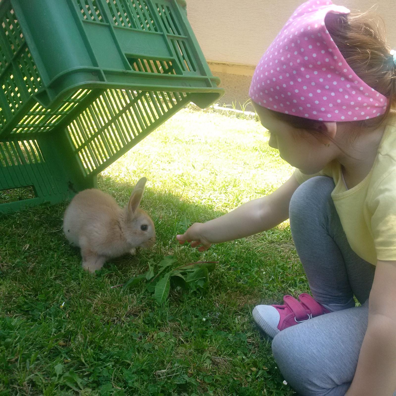 Aj my mame radi zvieratka, mame dvoch psikov, jedneho sme kupili synovi ked bol este malicky, potom k nam zavitala macicka tulacka, ktorej sa u nas zapacilo a udomacnila sa. Ku psikovi pribudol dalsi psik z utulku, aby sa mohli spolu hrat. Mame aj niekolko akvarii s rybickami, pocet presne neviem ale bude ich mozno aj 80-100. Aj korytnacku sme prichylili, ktora uz menila niekolko majitelov, bola zanedbana a nikto ju nechcel. Dcerka ked rano v lete vstane jej prva cesta je vyskriabat sa na celo postele, aby sa pozrela von oknom ci su tam koniky, alebo ich ide vecer s nami krmit. Teraz uz ako sa ochladilo, uz su koniky ustajnene. Zijeme na dedine, takze tu ma kazdy zvieratka, pre nas su samozrejmostou aj susedove kravicky ci ovecky. A tu je nasa najmensia milovnicka zvieratiek