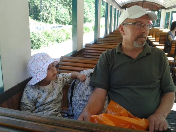 U nás je na prvom mieste tatinkove auto. Ale občas pre radosť ideme autobusom ku starkej alebo aj vláčikom ku prastarkej. Deti sa na to vždy veľmi tešia. Toto leto sme boli aj vo Vychylovke, kde sme sa povozili na starodávnom vláčiku - bafkáčiku 🙂 Dcérka už bola 2. krát, vôbec sa nebála. Dvojročnému synčekovi sa to po chvíľke obáv so zatvorenými očkami začalo páčiť tiež. Obaja vyplazovali na seba zeleno-modré jazyky z lízatiek, ktoré dostali od pani pri pokladni. Bol totiž deň detí a sprievodkyňou vo vlaku bola morská panna, strojvodcom zelenýý vodník 🙂