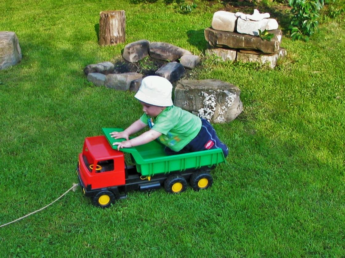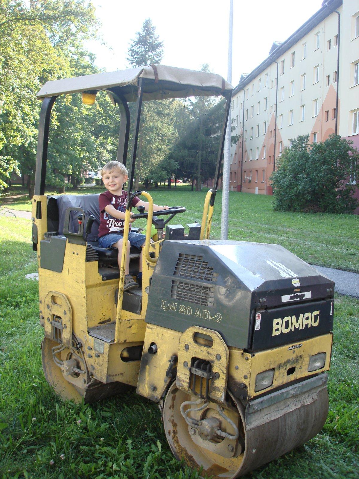 S nasim Samim sme prvy raz cestovali autom 300 km na svadbu , ked mal 4 mesiace, to si ale pamatame len my 🙂 Ked bol vacsi, chodil pozerat vlaciky so starkym (na fotkach su historicke masinky v nasom meste). Toto leto sme boli pozerat ujov cestarov,ako asfaltovali chodnik, a jeden z nich ho vysadil na valec (na fotke). Pocas zatvy sme spoza plota u starych rodicov pozorovali na poli traktor, ako zbera obilie a robi velke baliky slamy, a ked nas videl ujo traktorista, zobral Samiho do kabiny spolu s malym bielym psikom, ktoreho mal na sedadle. To bol najkrajsi zazitok tohto leta. Samimu sa to tak pacilo,ze poprosil starku, aby mu na narodeniny upiekla tortu - traktor. Vsak sa jej podarila? 😉