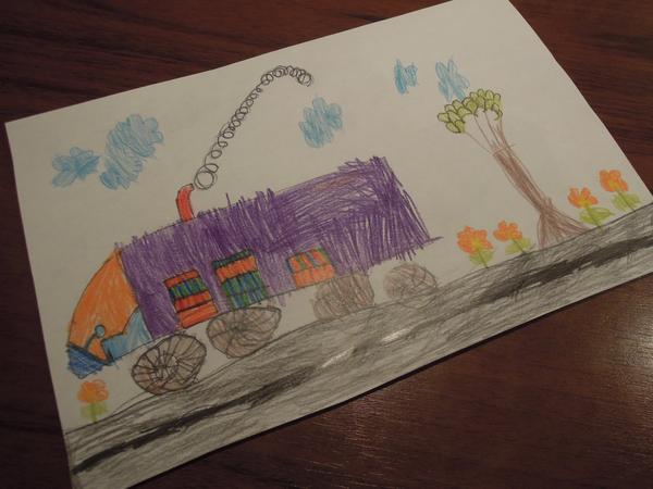 u nás vezie nákladiak drevo a to ešte aj na prednej kapote a pomedzito aby nebolo málo tak zemiaky 🙂 Drevo je vraj pre starkého a keďže prší nákladiak potrebuje aj dáždnik, kreslili sme s dcérkou spolu aj ked ona viac rozkazovala čo mám kresliť 🙂 ale drevo ,zemiaky ,slniečko a domčeky pre nákladiak kreslila ona
