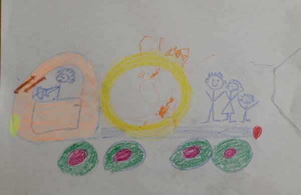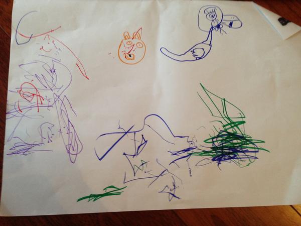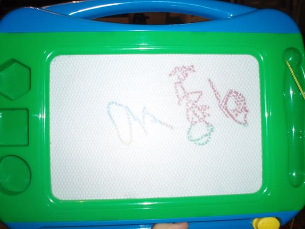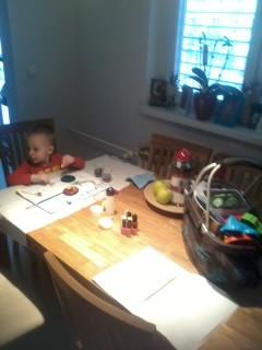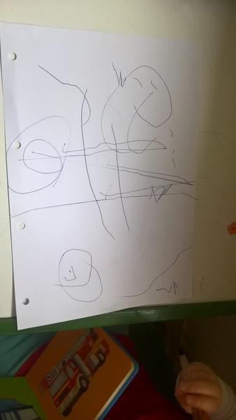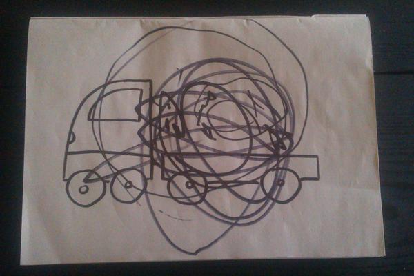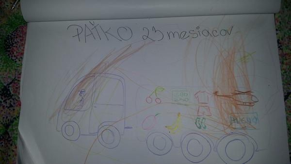Nas maly syncek (zachvilu 2,5 roka) sa velmi rad hra s legom, jeho najoblubenejsie je hasicske a policajne auto..Takto nakreslil naklad na aute, zevraj jablcko, rohlik a ryza 😉
