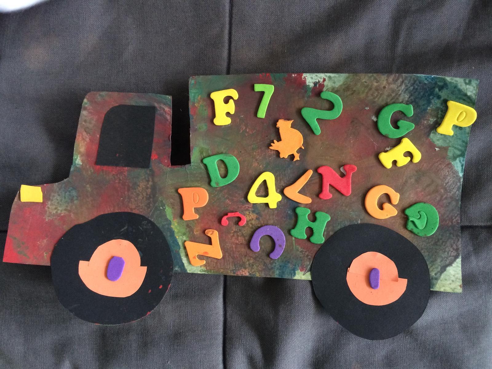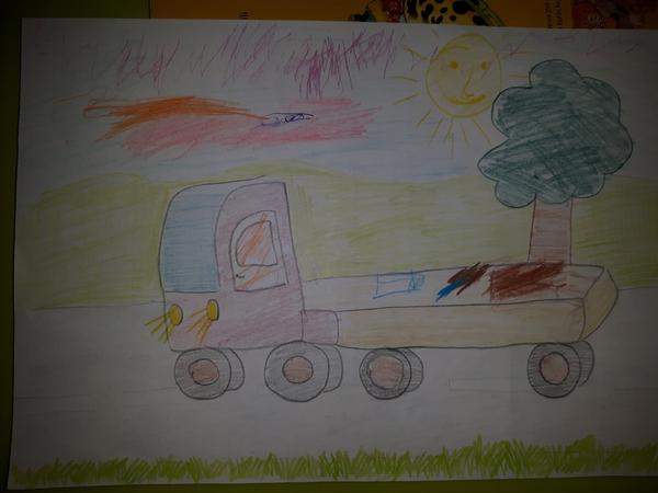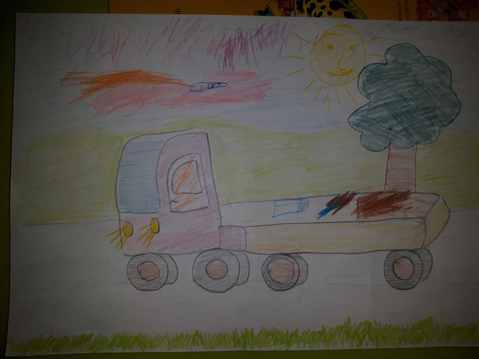 Náš spoločný výtvor. Keďže dieťa má len 2,5 roka, s obrysmi nákladiaka a cestou pomohla mama. Nákladiak nám doviezol uhlie na zimu, takže aj tento váš vezie uhlie. Na ceste sedí malý zajko 🙂, ktorý sa na to pozerá. Na nebi sú dva obláčiky a svieti slniečko.