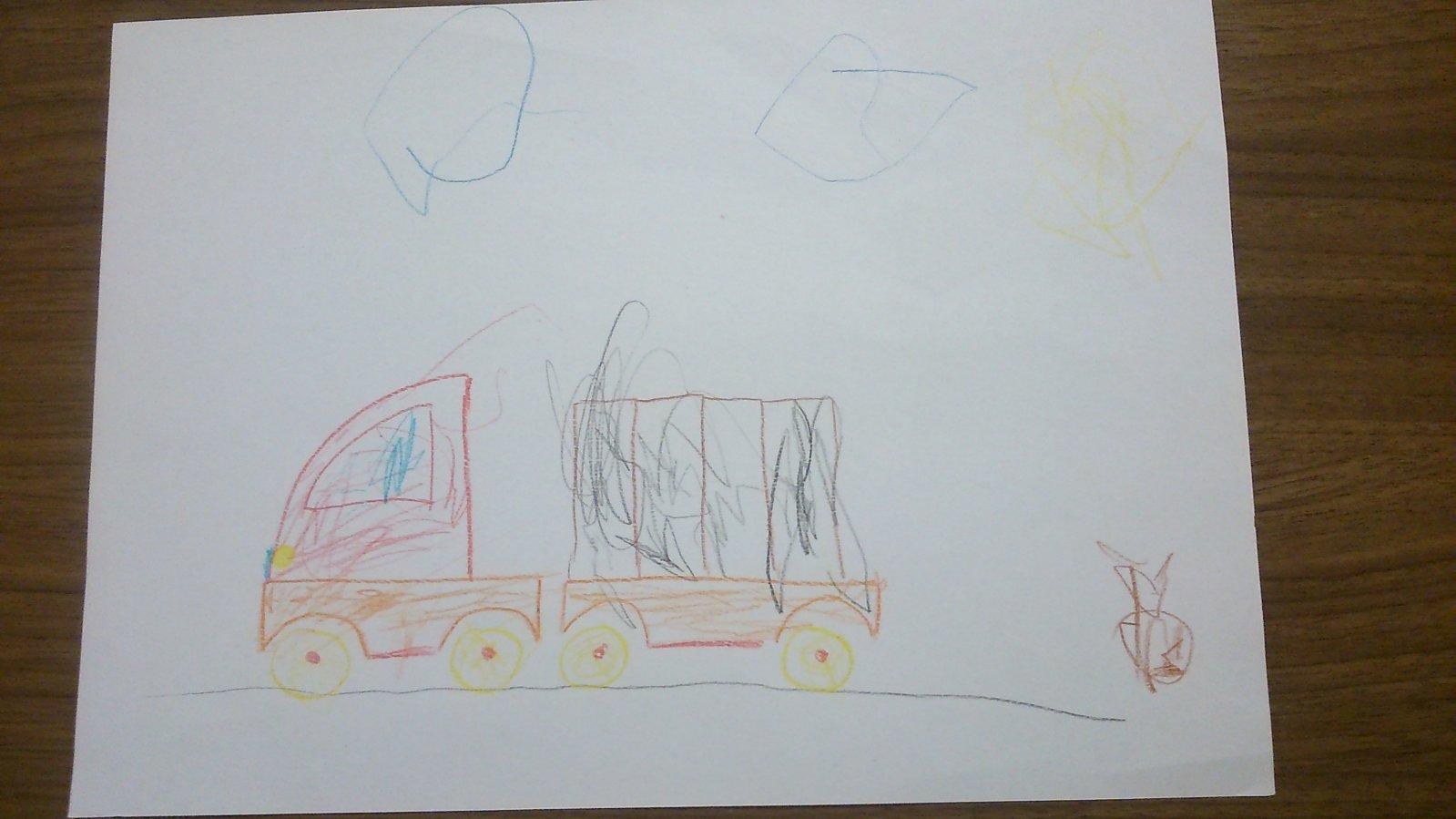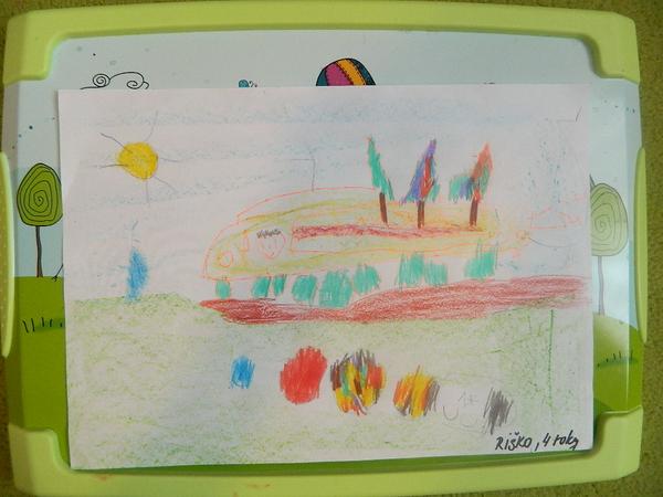 Náš Riško má 4 roky, nakreslil nákladiak, ktorý vezie Duplo jesenné stromčeky .