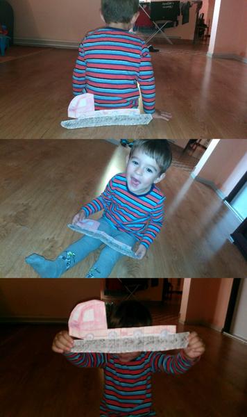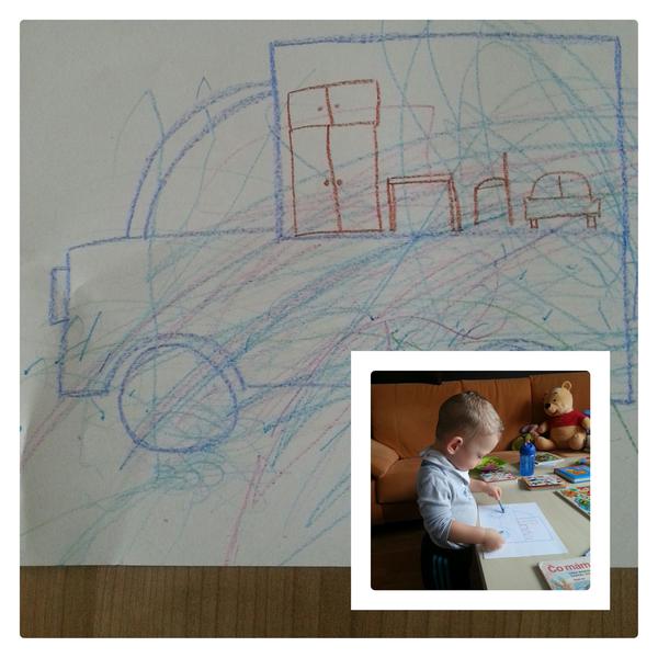 Kedze moj syncek ma este len rok a 8 mesiacov a sam kreslit nevie,tak sme si z toho v tento uprsany den urobili spolocnu cinnost-maminka nakreslila nakladiak,ktory prevaza nabytok a Marco ho takto krasne "vyfarbil" 😀 Jeho umelecku cinnost samozrejme sprevadzali vykriky "Brm-brrrm" a "Tu-tuuut",kedze auticka miluje a bez toho by to asi nebolo ono 🙂