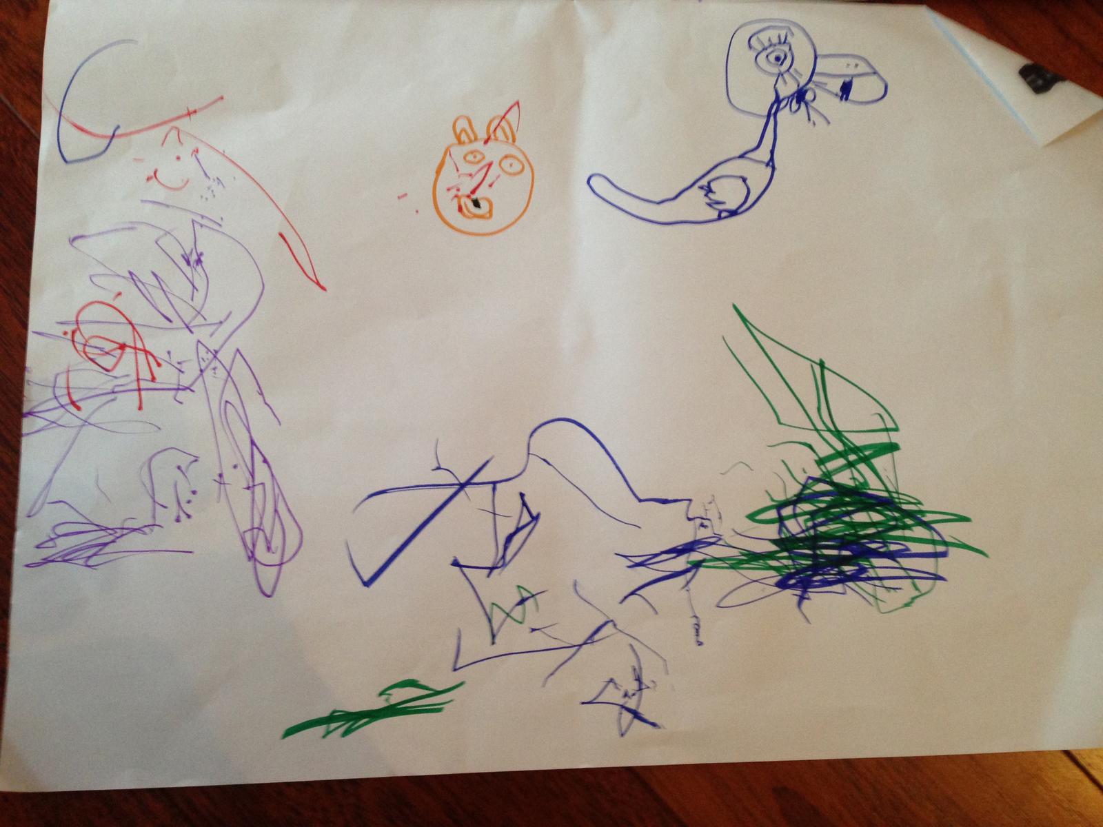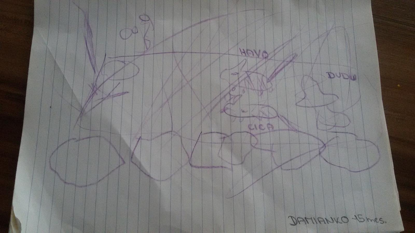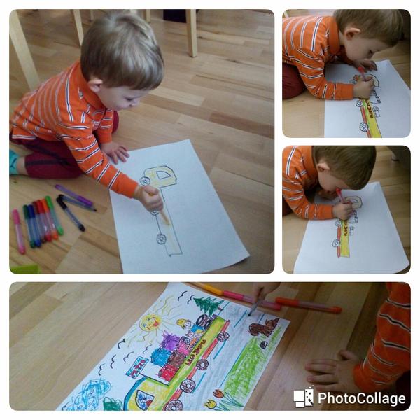 Samko 15 mesiacov kreslil auto brrm brrrm, macka a kačičku, ktoré auto vezie dokreslila sestrička Kristínka.