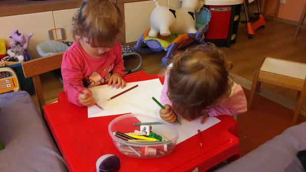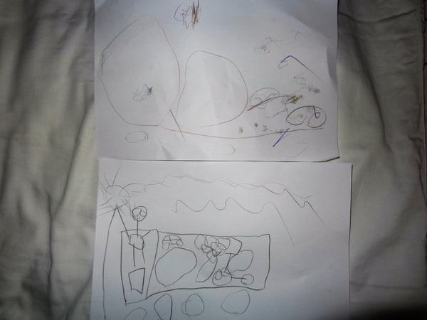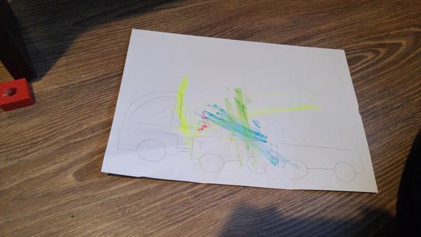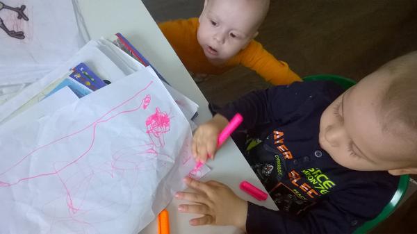 Moji dvaja krpci (2r.+2m a 8m) robia vsetko spolu, spolu sa hraju i kreslia.. Kedze im to moc nejde a ani toho vela nenahovoria, neviem co auto vezie, ale kreslili to sami...u mladsieho to dopadlo tak, ze ma zelenu pusinku :D
