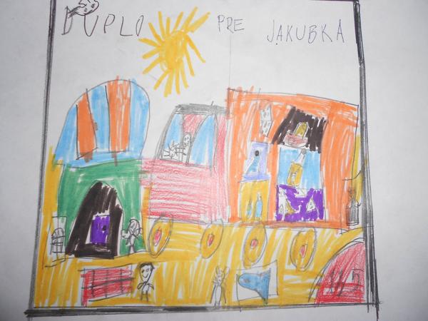 Syncek ma 3 roky a nakreslil naklafiak, ktory nas odvezie za jeho dobrym kamaratom Markom a jeho sestrickou a donesie mu este vela lega dupla