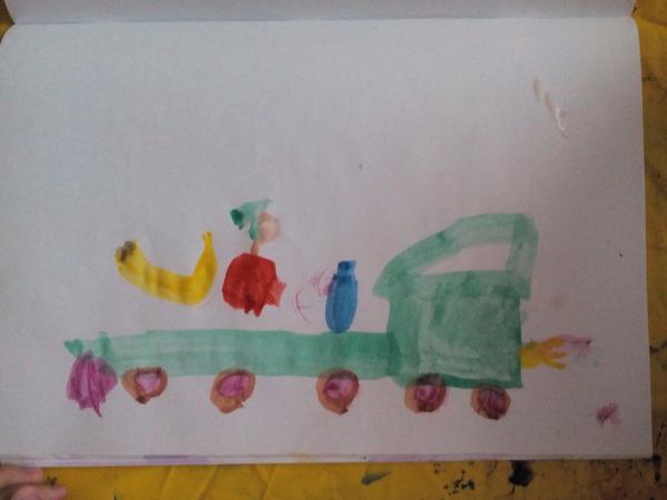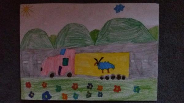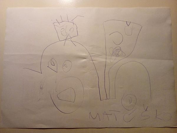 Nas 3 rocny Matusko;) pre vysvetlenie: kamion ma velke kolesa.na tom prvom je kabina a v nej ujo s nohami.pri druhom kolese je vlecka- na nej banan.jablko a ceresne...dufam,ze to je jasne vidiet ;))))) ( PS:pise lepsie ako kresli;)