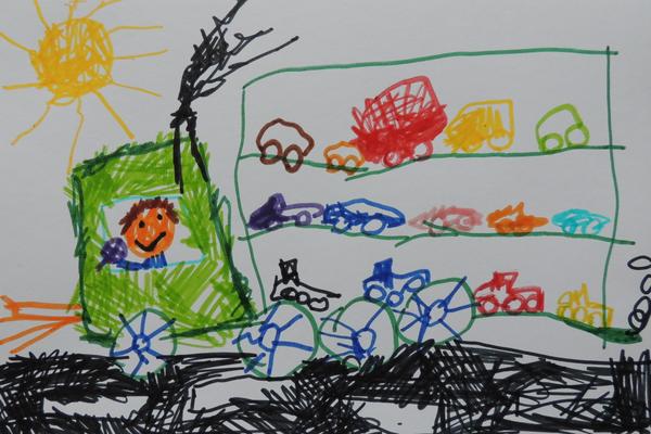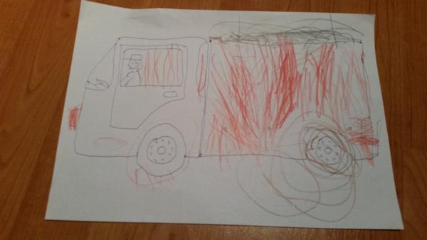 Syncek ma 3 roky a nakreslil nakladiak, ktory nas odvezie za jeho dobrym kamaratom Markom a jeho sestrickou, ktori byvaju daleko a donesie im v nakladiaku vela hraciek 🙂