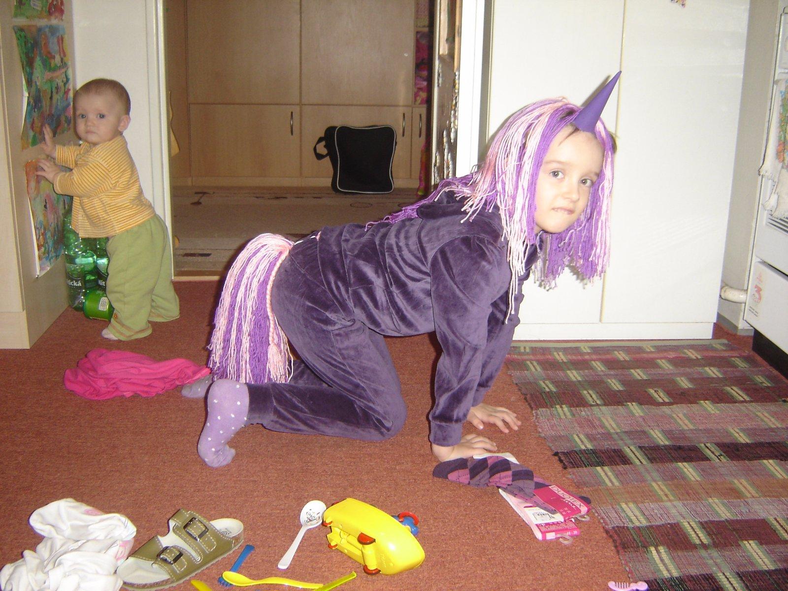 jej super atrakciu- masku jednorožca na ktorom by sa v lunaparku najradšej