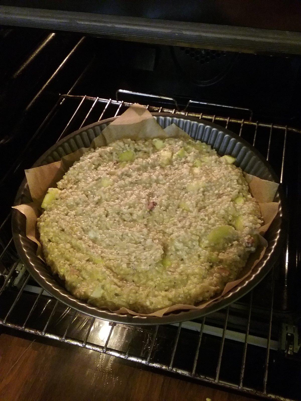 1 hrnček ražných vločiek, 3/4 hrnčeka mandľovej múky, 1/4 hrnčeka mlieka , 1/2 hrnčeka medu, 80g jablkového pyré, 1 vajce, 2 ČL bezfosfátového prášku do pečiva alebo vínny kameň, 3 kvapky mandľovej arómy.