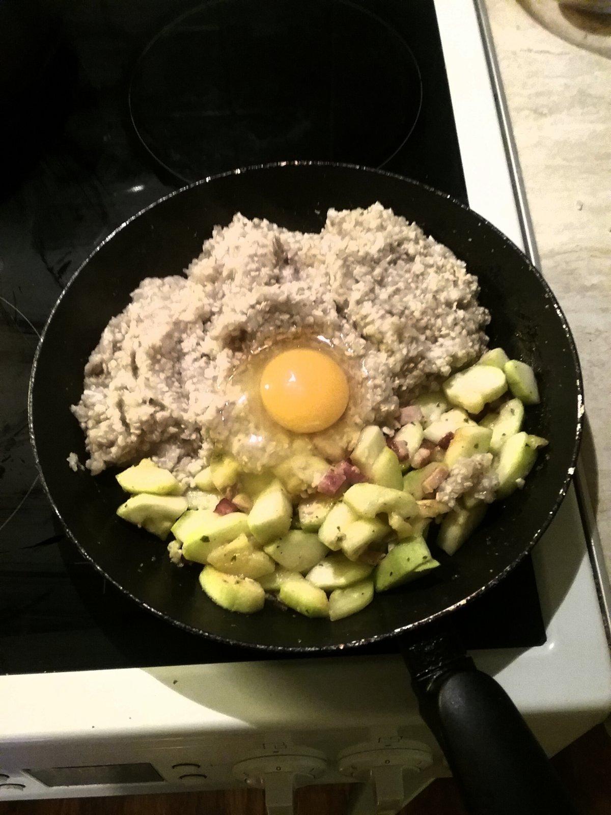 slaninku si opečieme na panvici, pridáme nakrájanú cukinu, posypeme morskou soľou, chvíľu popražíme a odstavíme. Pridáme pohánku, vajíčko, zmiešame, dáme na plech a 15 minút pečieme vo vyhriatej rúre na 200.