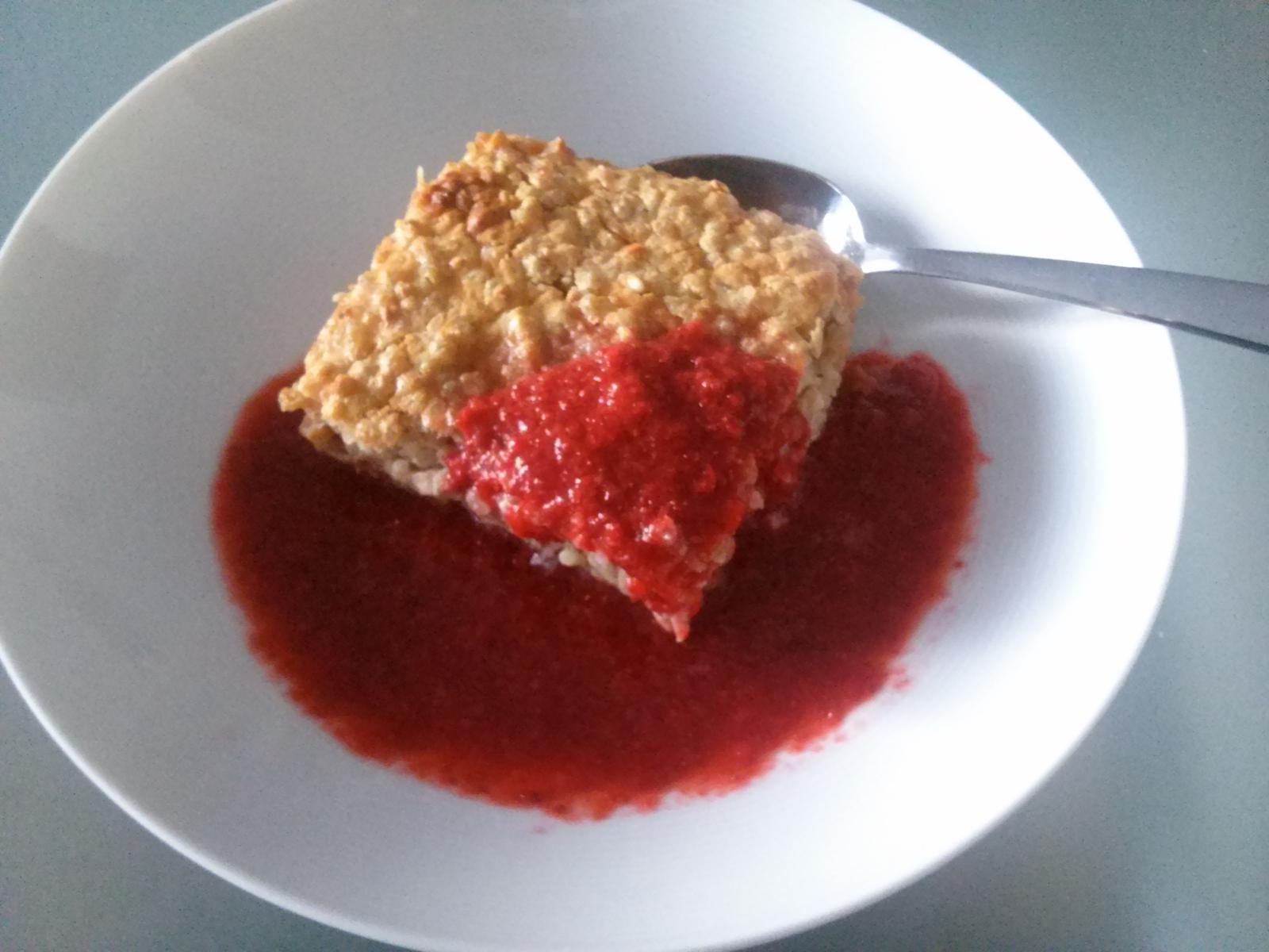 Pri vareni a peceni nemozem pouzivat mlieko ani mliecne vyrobky; takze aj klasiku ako je ryzovy nakyp viem urobit chutny a bezmliecny; miesto kravskeho mlieka davam ovsene a miesto masla kokosovy olej. Navrch polievam jahodovou drenou.