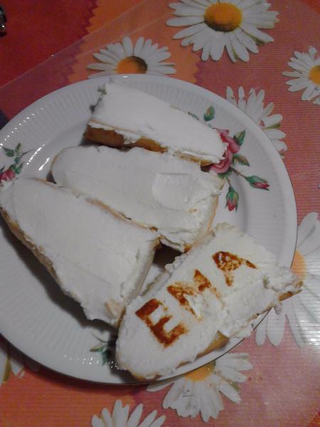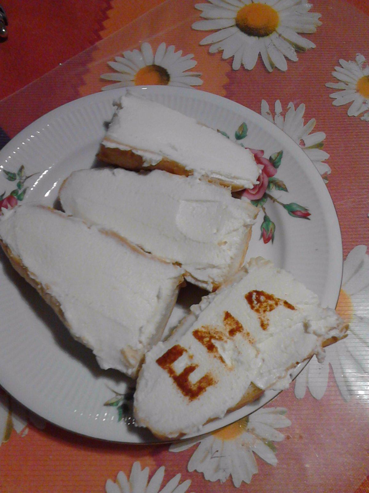 TVAROHOVÁ Pomazánka z tvarohu bez laktózy- vymiešame tvaroh natrieme a pre obzvláštnenie sme napísali aj meno toho kto to bude jesť.