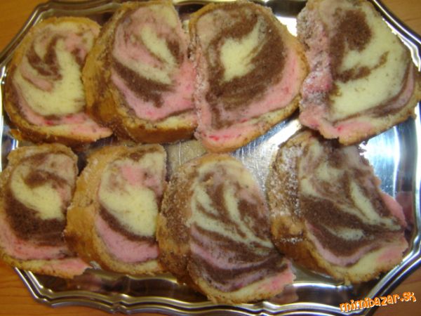 Prísady:5 vajec, 1,5 dcl oleja, 2 dcl kryšt.cukru, 1/2 prášku do pečiva a 3 rôzne pudingy ( ja som použila malinový, banánový a čokoládový najlepší je dr.oetker) Puding použijeme nevarený, čiže prášok namiesto múky.