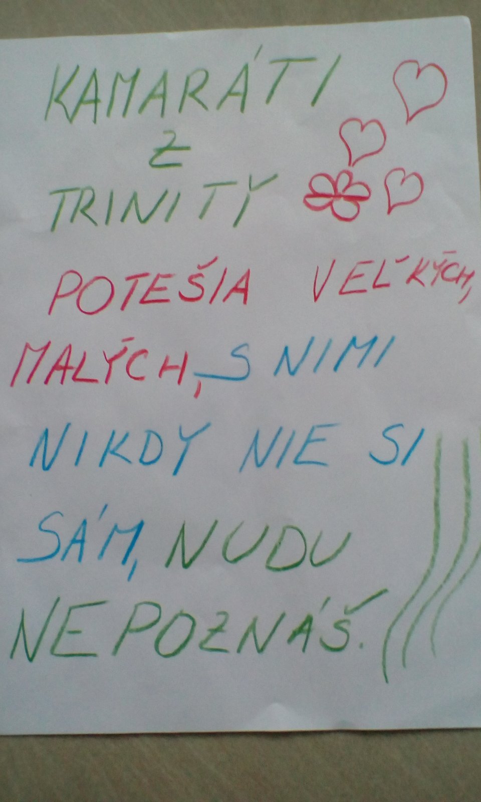 Deti, mládež, dospeláci, v Trinity sa každému páči. Zábavy tu veľa nájdeš, stačí ak k nám na dovolenku zájdeš. Nové zážitky a priatelia, veľkých aj malých potešia.