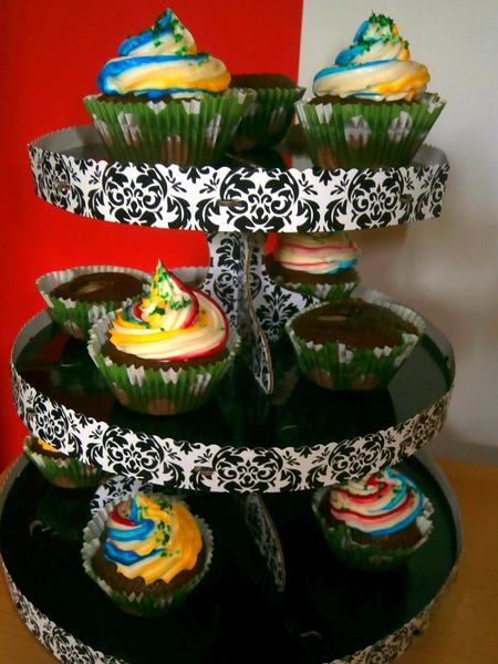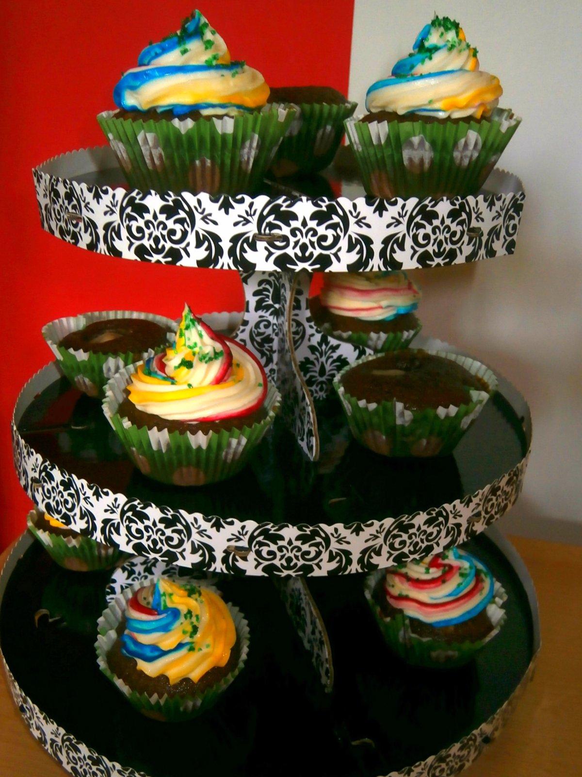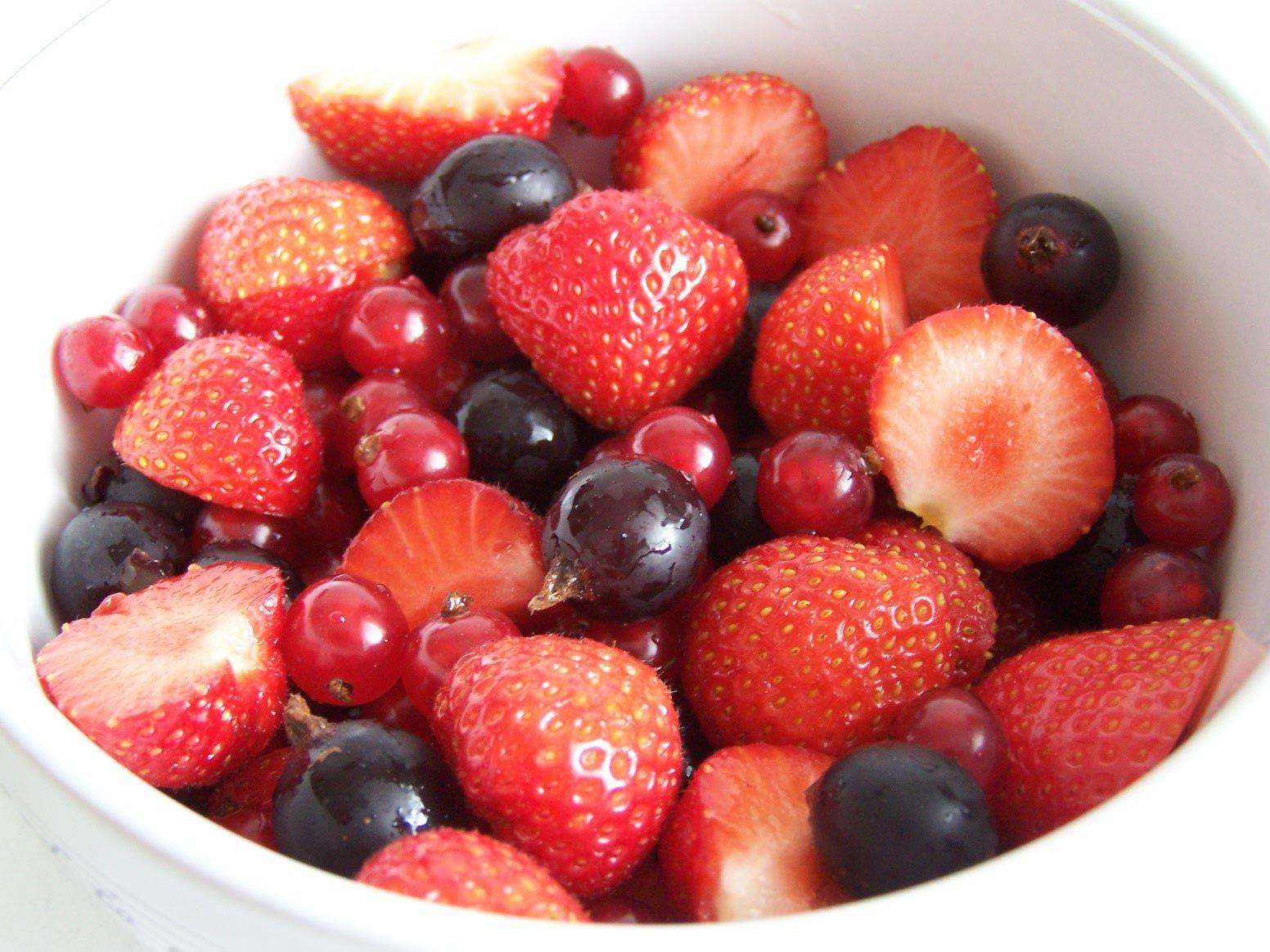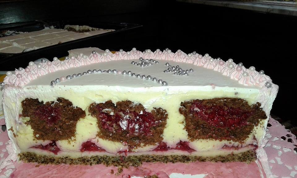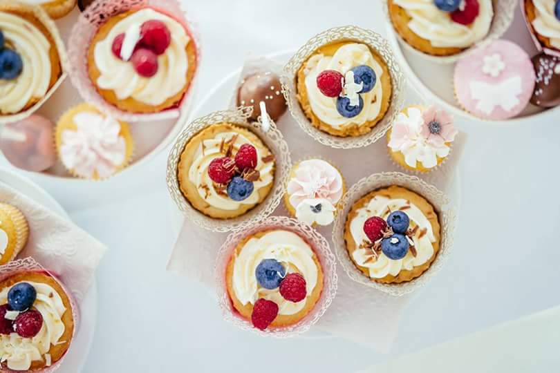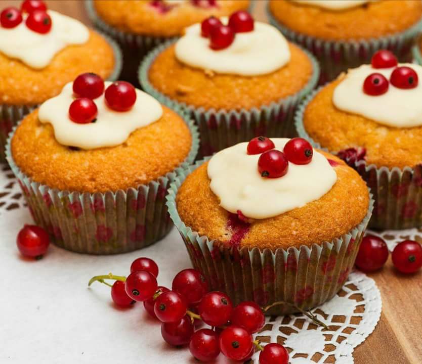 Muffinky plnene visnami a zdobene mascarpone kremom, Dierkovany kolac s cerstvym domacim ovocim.