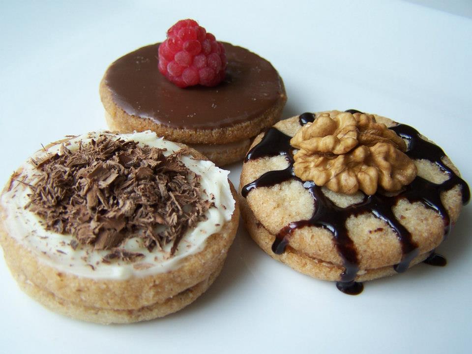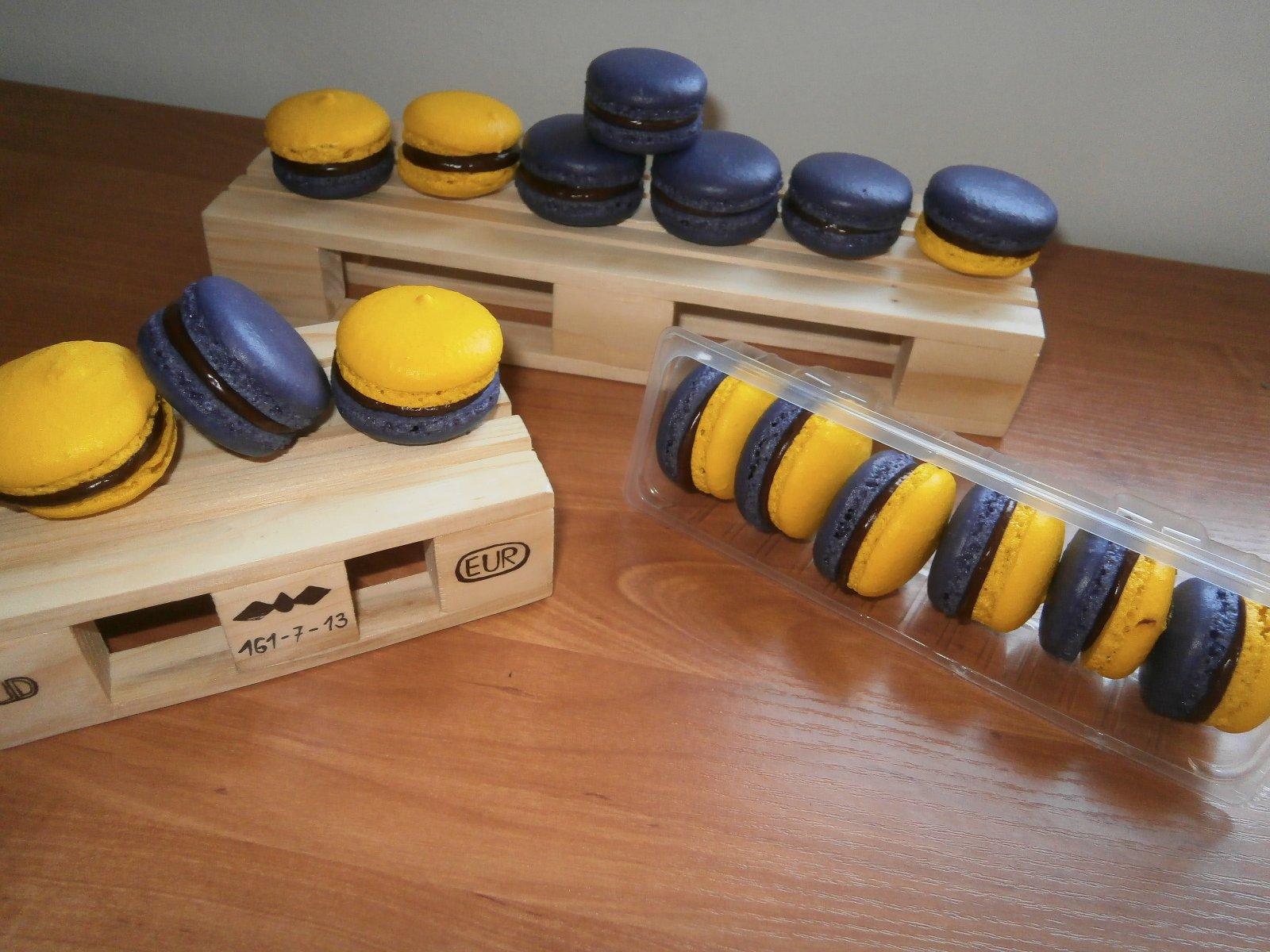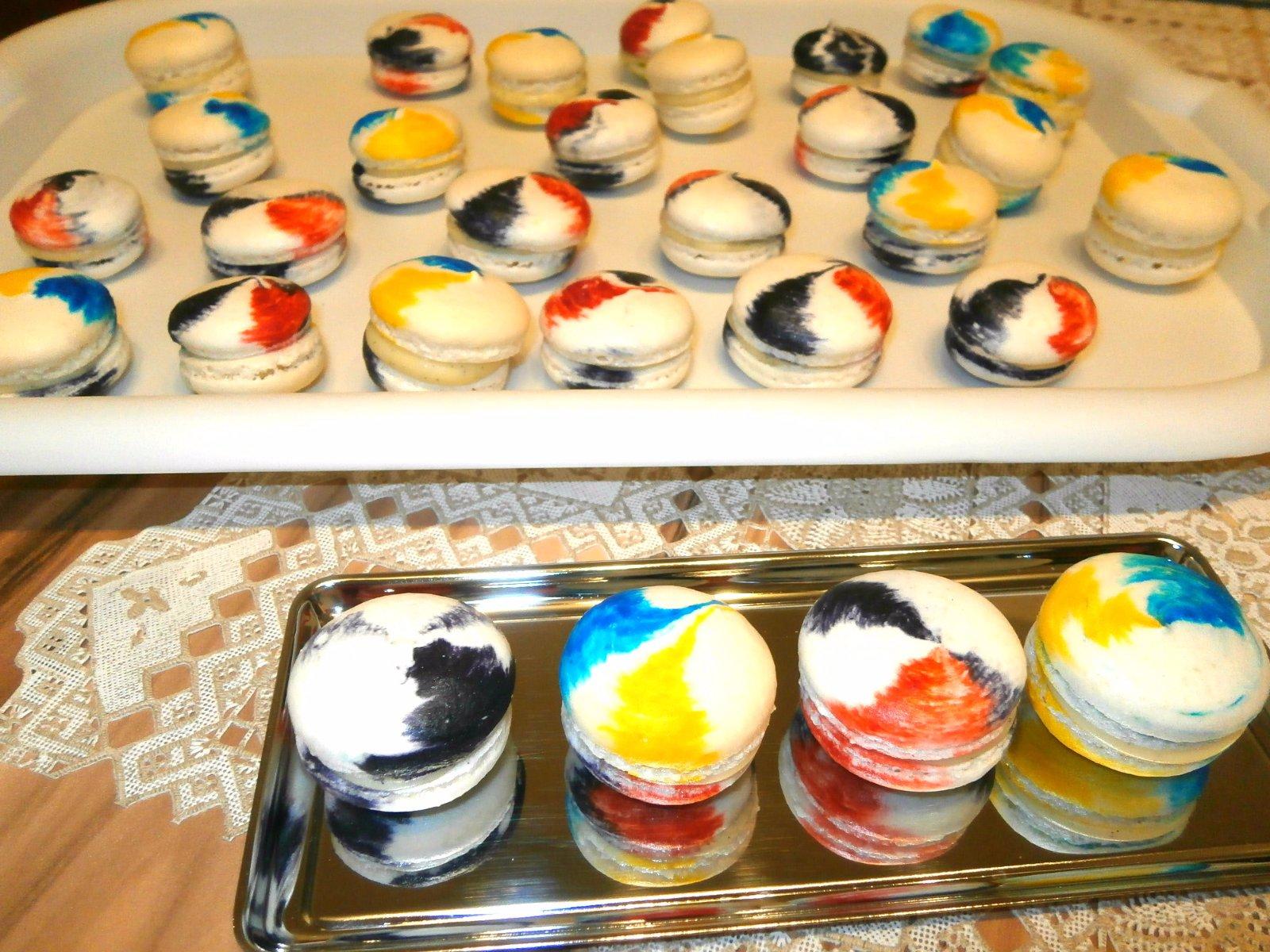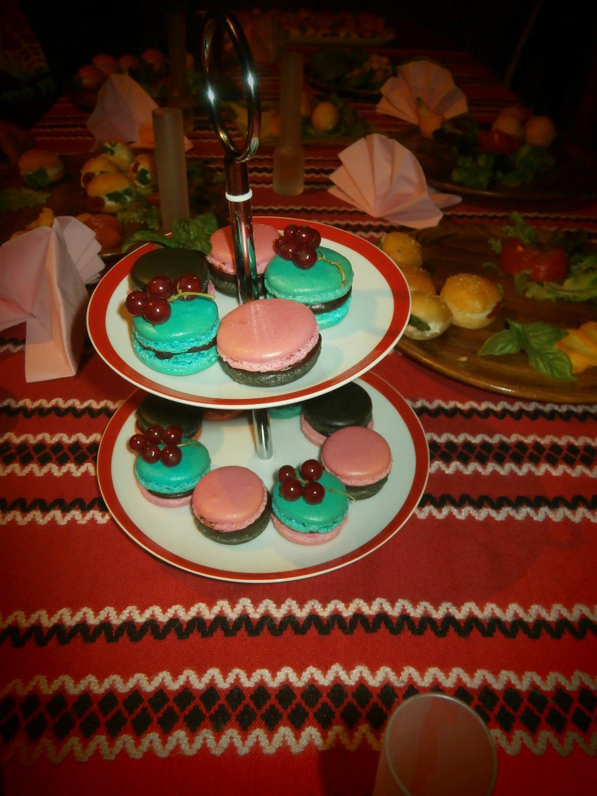 Na fotkach su Francuzske Macarons (makronky) s roznymi plnkami - slany karamel, tvarohove, vanilkove z pravej vanilky. Potom tam je Smotanova torticka zdobena lentilkami, Jablkovo - malinova omacka (cerstva vyziva).