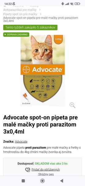 @leyla97 najlepšie je mačku chytiť dať jej hlavu mierne do zadu a podať tabletku rovno do úst - aspoň takto dával manžel našej keď brala antibiotiká...mám 2 mačičky vonku a tie by mi tabletku nezjedli a keď sa dá do jedla nie je 100% že ju prehltnu..tak im dávam spot on pipetu na krk - vyššie ako sú lopatky - Advocate...ale 3 ks stoja okolo 36€
