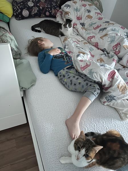 U nás sa nič nezmenilo, mali sme asi päť mačiek. Prvé dva mesiace som ich nepúšťala do spálne na noc, keď spal, potom som zistila, že k nemu do postieľky neskončia. Až neskôr mu zvykla jedna spávať pri nohách. Alebo sa vozili v kočíku. Až keď bol syn väčší, že lozil, tak sa stalo, že boli škrabance, ale aspoň pochopil, že mačke nemôže robiť čo chce. Zo staršími doteraz nie je sú nejaký extra kamoši, naše mačky majú rady svoj pokoj. Mačiatka, ktoré s ním vyrastajú si na neho skôr zvyknú. Ale záleží od povahy. Moje chcú spať 😀 Potešili sa, keď začal do škôlky.