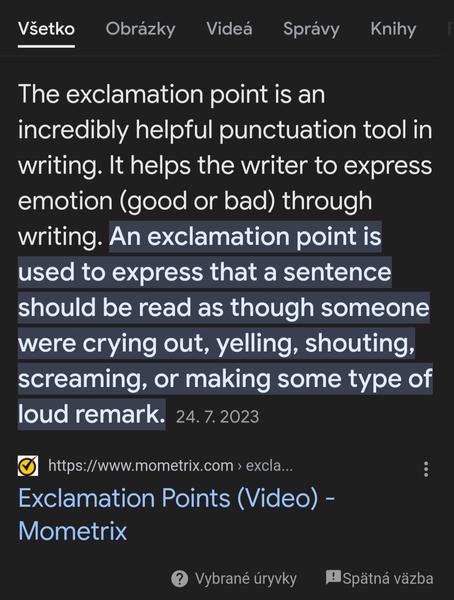 @aliaray1 kricat??? The exclamation mark (!) (also known as exclamation point in American English) is a punctuation mark usually used after an interjection or exclamation to indicate strong feelings or to show emphasis. The exclamation mark often marks the end of a sentence, for example: "Watch out!" Similarly, a bare exclamation mark (with nothing before or after) is often used in warning signs. The exclamation mark is often used in writing to make a character seem as though they are shouting, excited, or surprised.