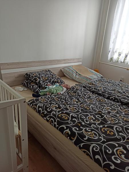 Tu bocnu zabranu z postielky sme odmontovali a postielku prirazili k posteli🙂 v noci este kojim a takto mame kazdi svoj priestor😉