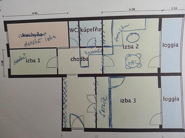 @nelca84 nechcem rozdeliť žiadnu izbu. Detské izby budú miestnosť izba 1 a bývalá kuchyňa.. viem že sú to izby malé šírkou ale v izbách bude len posteľ a nejaká komoda atď. Najväčšia bude v byte spálňa a tam roldor skrine aj na chodbe možno 🙂