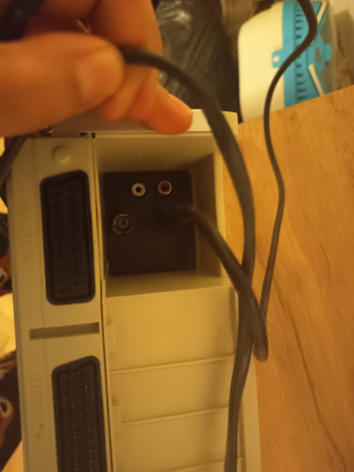 Predpokladám, že prvé dve fotky sú TV prijímač. A zvyšné sú ten VCR. To sú všetky konektory, čo sú na telke? Tá telka musí mať ešte aj iné vstupy. A na VCR nevidno. aké konektory sú v tej diere.