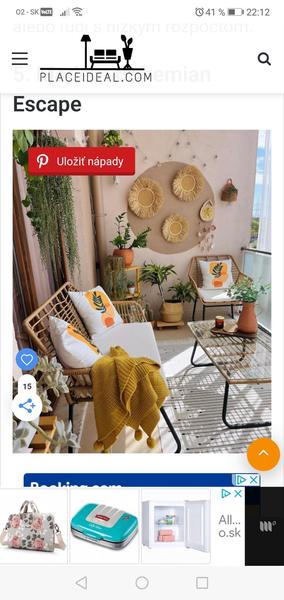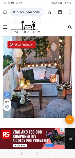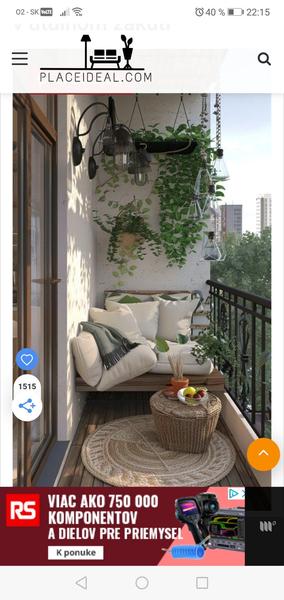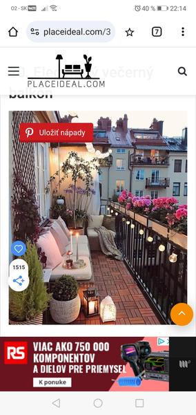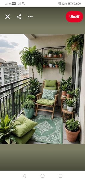@lucka40 Ahoj, záleží aj od metráže. 🙂Podľa toho by som zvolila sedenie. Ak je balkón malý, tak stačí decentný stolík s dvomi stoličkami na vonkajšie použitie. Ak je balkón väčší, vieš tam dať aj lavicu na ležanie, dlhšiu vonkajšiu sedačku. Vkusne vyzerá ratan, kovový nábytok s výpletom, drevené stoličky... Na kresielka dáš vankúše s poťahmi a deku, na zem môžeš dať koberček. Balkón dotvoríš aj kvetmi vo vkusných črepníkoch (na nožičkách, závesné črepníky zo stropu, alebo na zábradlie). Lampášiky, led lampičky, svetielka vieš tiež dať na zábradlie. V ikei predávajú aj drevenú balkónovú podlahu Runnen, ktorú tam vieš nainštalovať aj sama. Pozri inšpirácie na pintereste s tagmi ,,boho small balcony inspiration,,.
