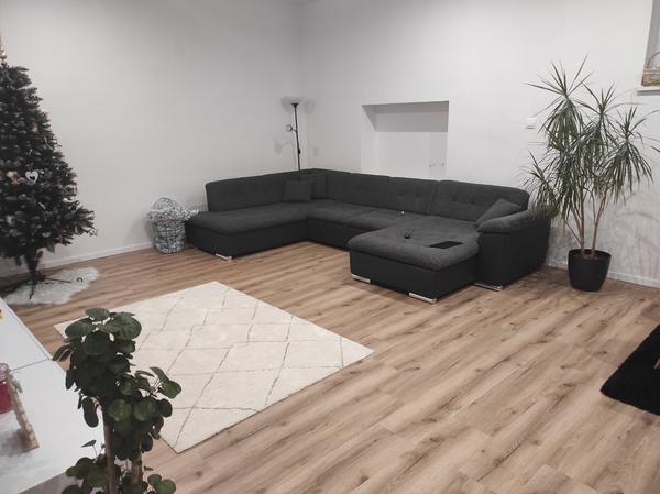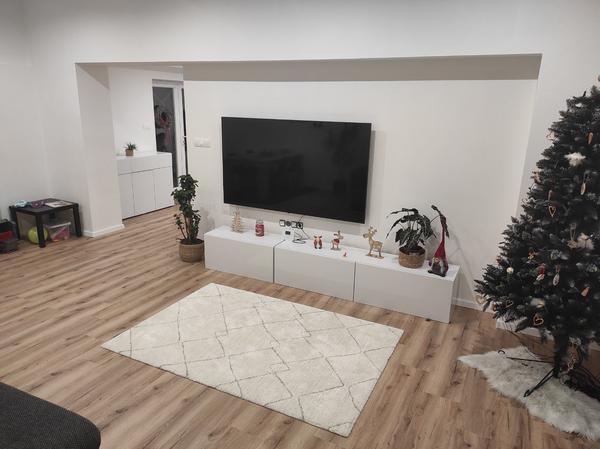 Mno mne neladí ten koberec pod gaucom. Moc tmavé so sedačkou. Nechápem prečo je v rohu napchatý ešte stôl, pôsobí to neupravene a stiesnene. Radšej by som koberec posunula do stredu a ten konferenčný stolík položila naň pred pohovku. Vianočný stromček by som dala do rohu miesto lampy pred okno. Pripájam sa k tomu, že tie biele skrinky sú moc. A vôbec nevidím nič s ničím prepojené, nič spolu neladí... Keď budeš mať novú pohovku skús poriešiť nový koberec, ktorý bude buď farebne alebo vzorovo ladiť s vankúšmi na pohovke. Prípadne prepojiť to obrazom. A kvetináč by som dala lesklý biely ako poličky nech nevyzerá kvetina akoby tam nepatrila...to postupom času ešte prepojis dekoráciami...
