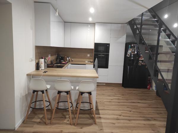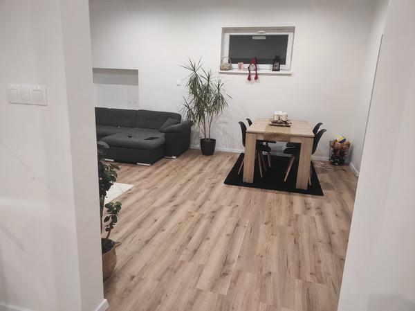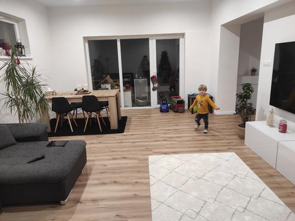 inak krasna kuchyna, pracovna doska a obklad za linkou pekne ladia s podlahou. dala by som rovnaky obklad aj za TV, nech sa priestor zjednoti.