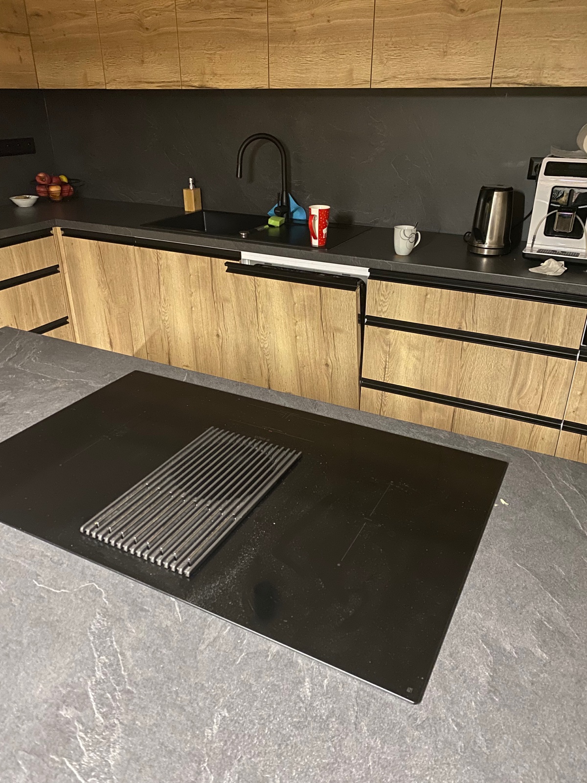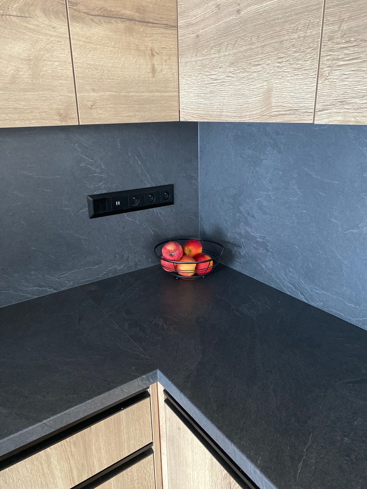 @agatan bordel si nevšímaj, teraz večer som fotila, aby bolo vidno rozdiel… je to ten istý material, len na ostrovčeku sa svieti a tam vidno tu bridlicu a vzadu je tma a vyzerá to ako čierny mat 🙂