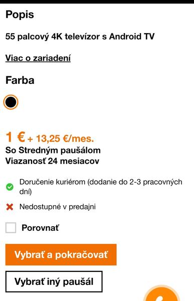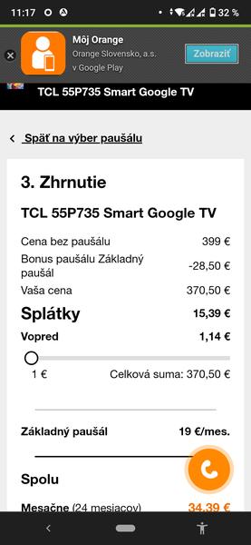 https://www.planeo.sk/tcl-55p735 V Planeo ho mas teraz na akciu za 359e, v Orangei ti vychadza 370e, ak ho vezmes s pausalom. Chapem, ze pri splacani to az tak nepocitis, ale chcem ti len ukazat, ze ak by ste ho velmi chceli, tak ho mas inde lacnejsie. Kedysi som brigadovala v O2 a zariadenie k pausalu nikdy nebolo lacnejsie ako ked ho kupis v priamo v nejakom obchode.