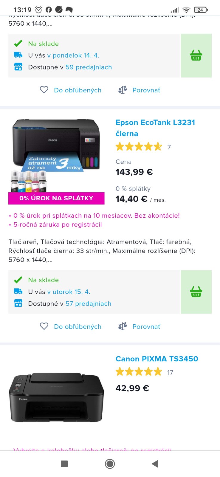 Tak napríklad Epson EcoTank L3230 od 132€ v Planeo za 144€