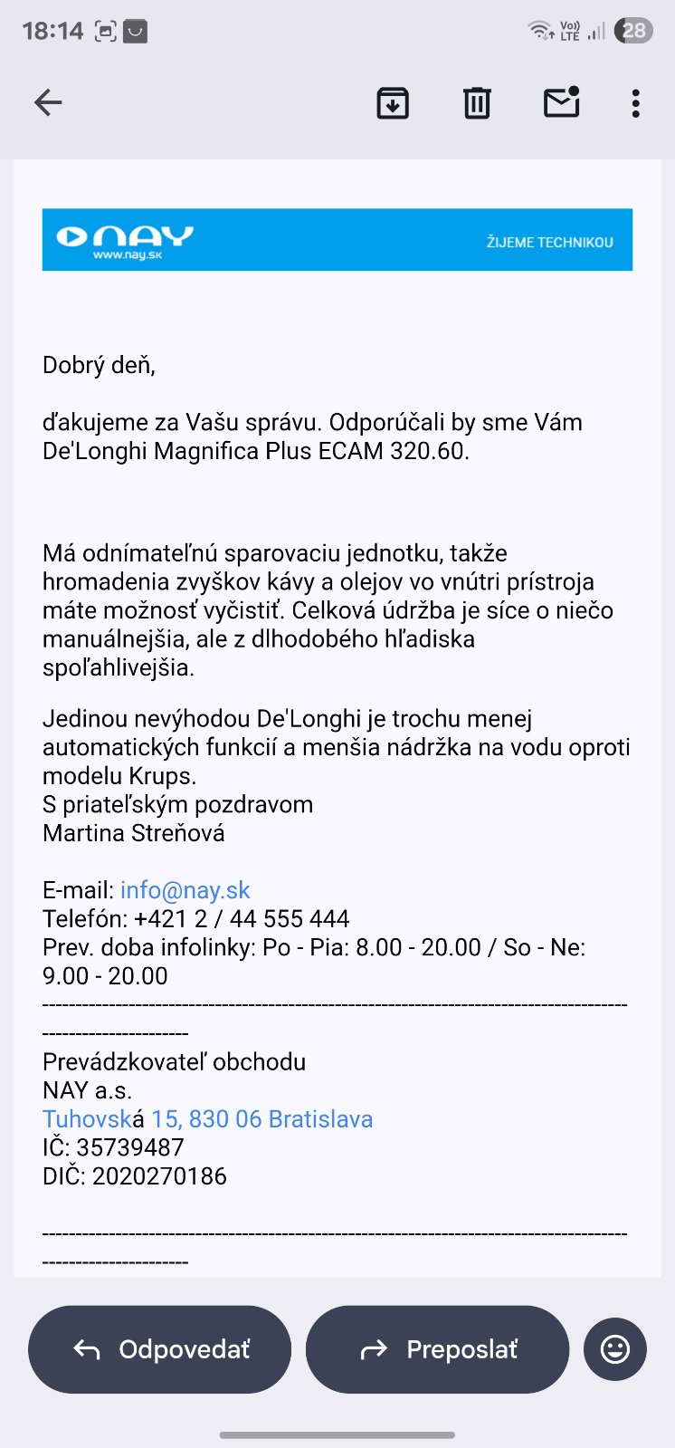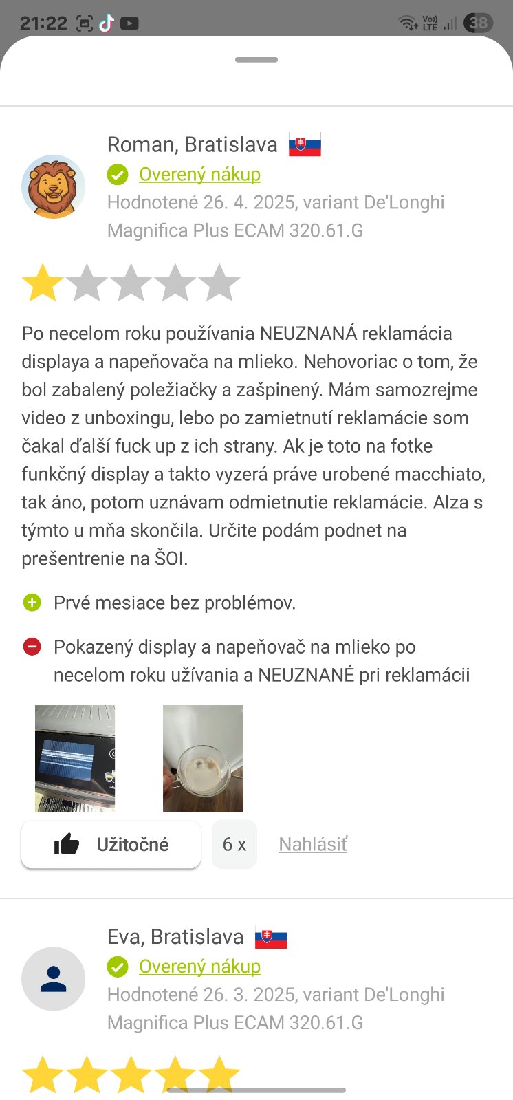 @miss_foxy ďakujem za odpoveď, ale delongi tiež ma problémy a je ich viacej keďže je to najpredávanejši kavovar Máte pravdu, ale veľa predajcov ani nedáva vedieť, či produkt dorazil. To isté platí aj pri Delimano. Na druhej strane Delonghi a Alza už majú určitú reputáciu a skúsenosti zákazníkov – stačí pozrieť recenzie. Niektoré verzie mali napríklad problémy, že tiekla voda, praskla hadička, alebo prestal fungovať displej. Takéto chyby sa môžu vyskytnúť u každej značky. Bohužiaľ, keď je produkt v poriadku, ľudia často recenziu nepíšu, ale keď sa pokazí, hneď ju pridajú. Takže je možné, že ide len o jeden problémový kus z tisícky. Na druhej strane je pochopiteľné, že negatívne recenzie na Delonghi môžu človeka zneistiť.
