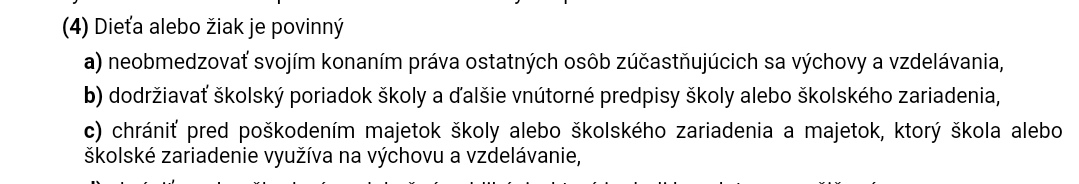 @zana124 presne ako s dešpektom sa vyjadrujes voči zákonu , autoritám aj mne (akože niekto určite som) tak vyjadrujes biedu , ako vzorka slovenskej spoločnosti. Určite sa to nechápe, tak, že keď žiješ v súlade s pravidlami , že si na špagatiku. Každá civilizovaná spoločnosť má zákony a pravidlá, ktoré by sa mali dodržiavať, aby nám väčšinovo vo dobre. Inak vznikne anarchia a dobre nebude nikomu. Školský poriadok je jedným z nástrojov, ktorý nastoľuje vopred dané pravidlá, záväzné pre školákov, pedagógov, ale aj pre rodičov.